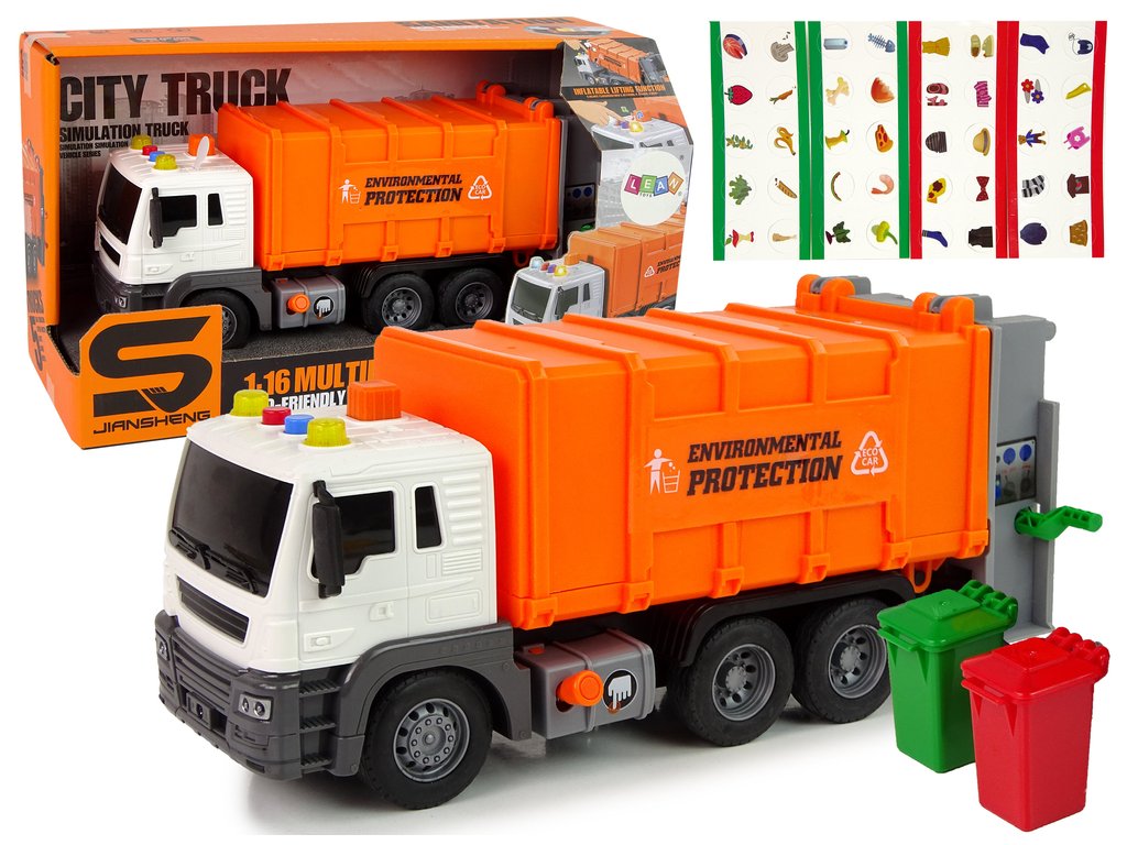 Popelářské auto pro děti je skvělá hračka pro všechny kluky, kteří si rádi hrají s auty. Součástí popelářského vozu jsou samozřejmě také 2 třídicí popelnice. Vozidlo se dynamicky pohybuje všemi možnými směry a je vybaveno pohonem zadních kol. Miniaturní verze potěší i zvukovými efekty, které povzbudí ke hře a podnítí fantazii.