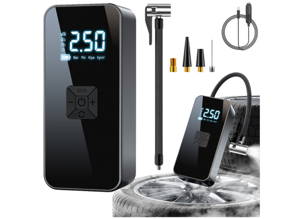 Moderní a výkonný přenosný kompresor, který je ideálním pomocníkem jak pro každodenní použití, tak i v krizových situacích. Spolehlivě nafoukne pneumatiky u auta nebo kola, míče, matrace, čluny a další vybavení, které potřebuje správný tlak.