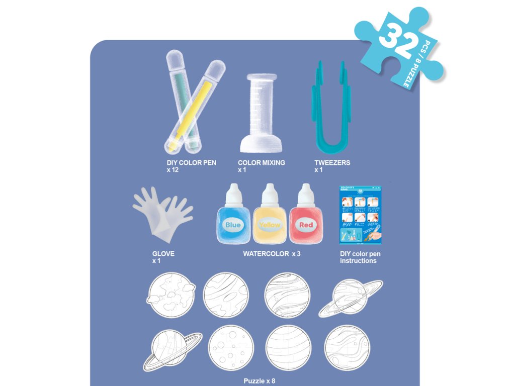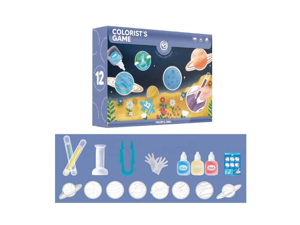 Objevte vesmír s touto vzdělávací sadou, která kombinuje kreativitu s učením. Sada obsahuje akvarelové fixy a puzzle s motivy osmi planet naší sluneční soustavy. Je ideální pro malé objevitele, kteří se chtějí dozvědět více o vesmíru a zároveň si užít zábavu s malováním a skládáním.