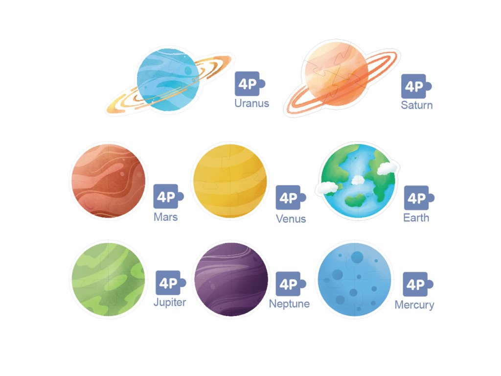 - Puzzle: Skládací puzzle s motivy osmi planet, které pomáhají rozvíjet jemnou motoriku a logické myšlení.