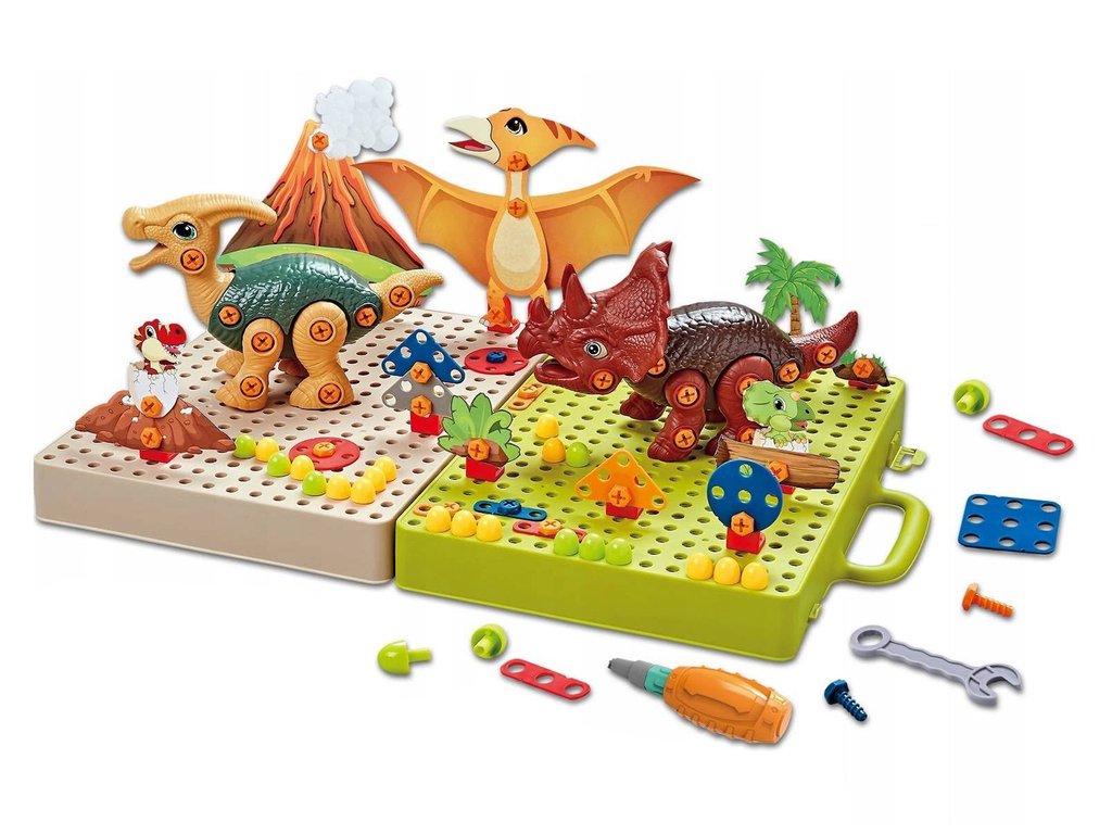 Celá sada obsahuje dva druhy dinosaurů k sestavení: velociraptor a tyranosaurus. Každý z nich se skládá z mnoha částí, úkolem tvého dítěte bude jejich sestavení pomocí šroubků a šroubováku. Kromě nich najdeme v setu desky vulkanu, stromy nebo jiné dinosaury, které doplní prostředí. To ale není vše!