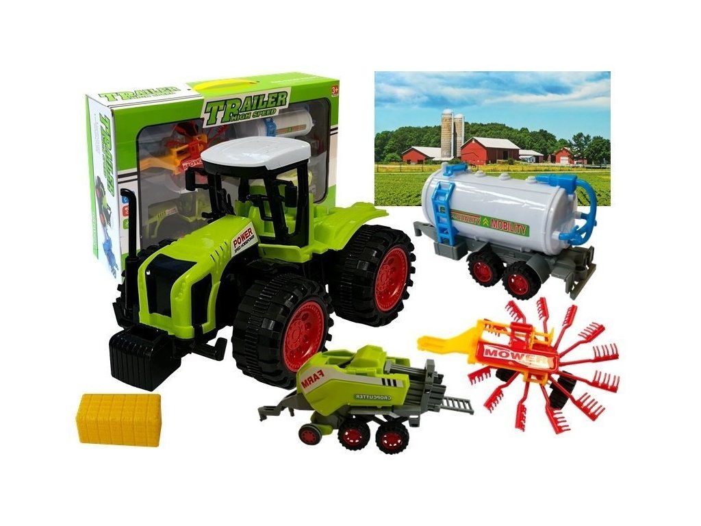 Sada farmářských strojů je ideální pro malé nadšence zemědělství. Obsahuje realisticky zpracovaný traktor a připojitelné přívěsy, které umožňují různé druhy her, jako je sběr sena nebo zalévání.