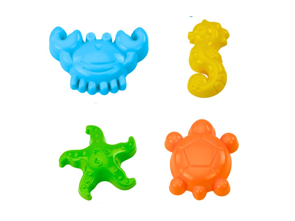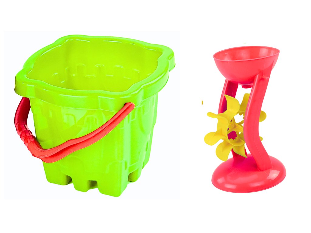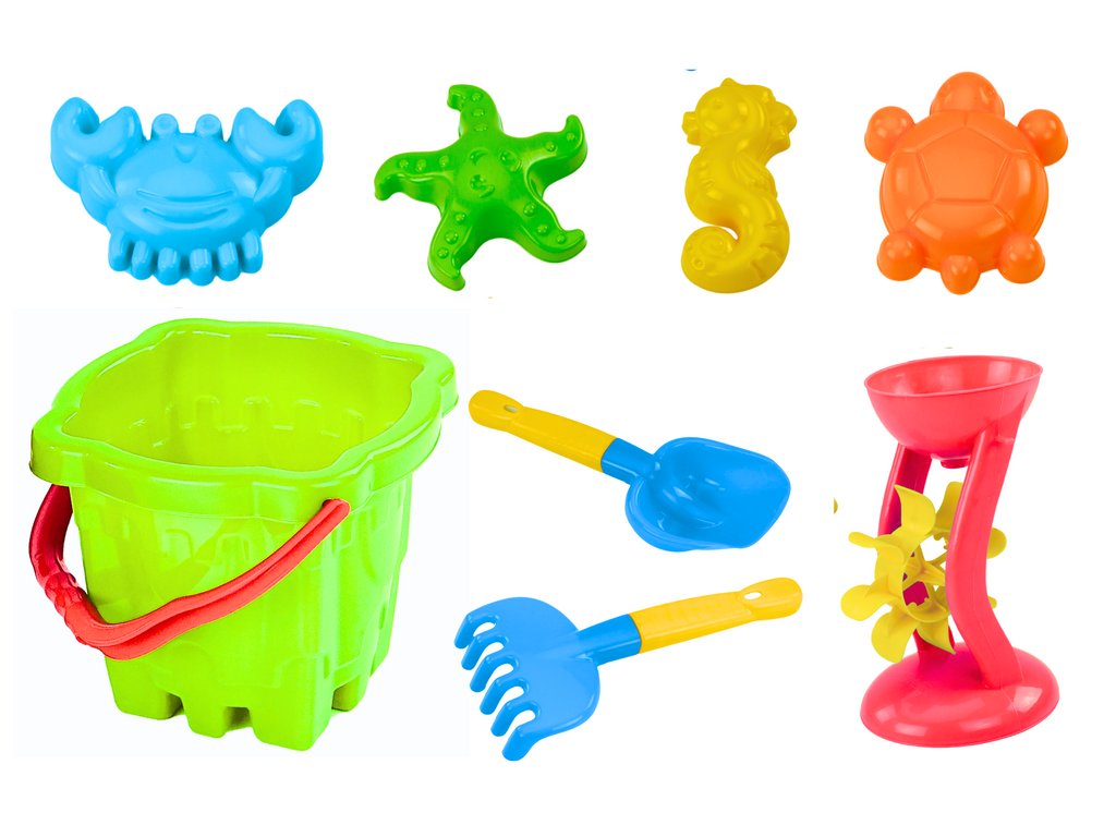 Sada hraček na písek obsahuje 9 prvků, včetně kbelíku ve tvaru hradu, mlýnku, hrábí, lopatky, sítka a formiček. Vyrobena z bezpečných, odolných materiálů v pestrých barvách, podporuje kreativitu, jemnou motoriku a zábavu na pláži či v pískovišti.