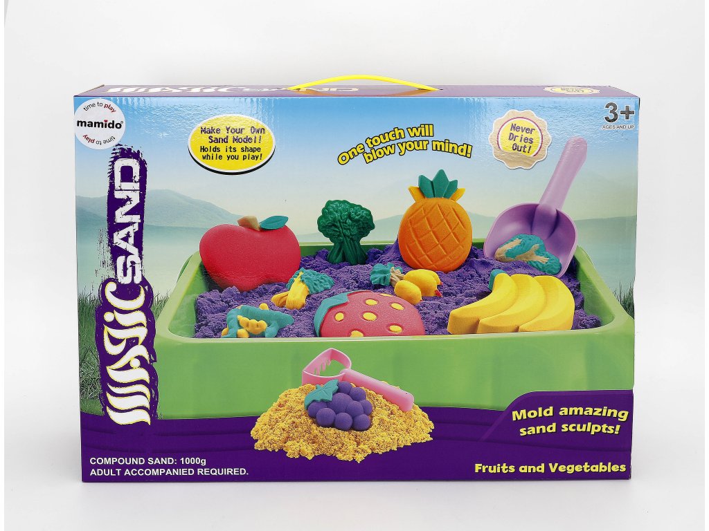 Sada obsahuje různé formičky s motivy ovoce a zeleniny, podložku na hraní a nástroje, díky kterým děti snadno vytvoří barevné postavičky, ovoce či celé scény. Kinetický písek podporuje jemnou motoriku, kreativitu i fantazii a je skvělou alternativou k běžnému modelování.