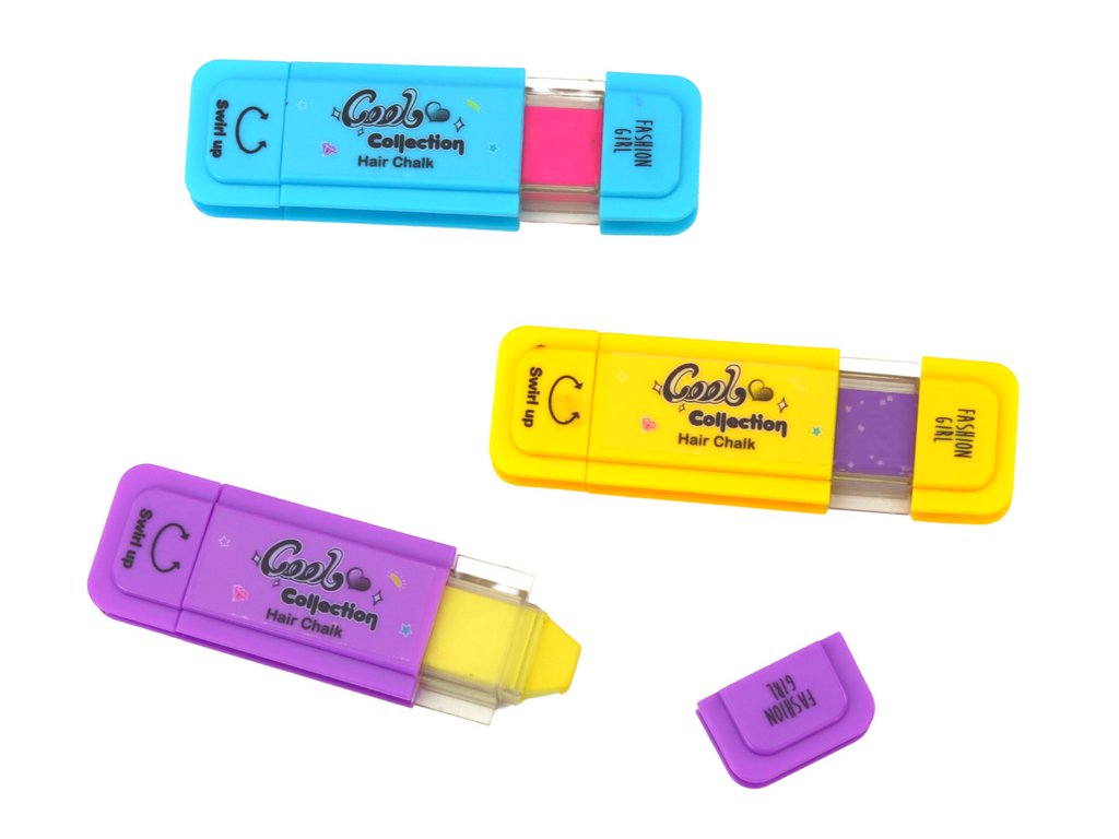 V sadě najdete tři křídy na barvení vlasů v různých barvách: fialové, růžové a žluté, které umožňují kreativní úpravu účesů. Díky nim mohou děti měnit barvu vlasů podle svých preferencí a nálady, aniž by musely provádět trvalé změny.