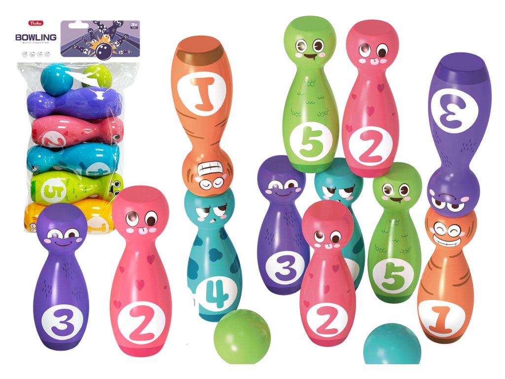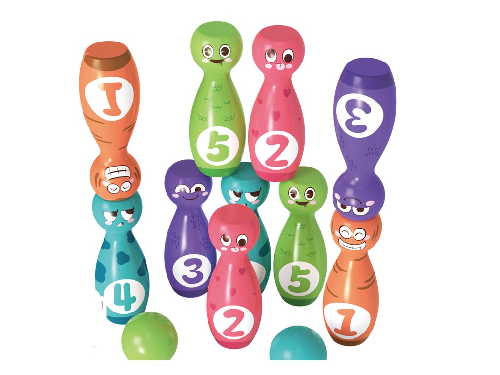 Součástí sady je 10 kuželek, každá s jiným obličejíkem a v různých barvách, což přitahuje pozornost dětí a povzbuzuje k hraní. Navíc mají kuželky seříznuté vrcholky, což umožňuje jejich skládání na sebe a budování barevných věží. Díky tomu si děti mohou užívat nejen tradiční hru kuželek, ale také kreativní skládání.