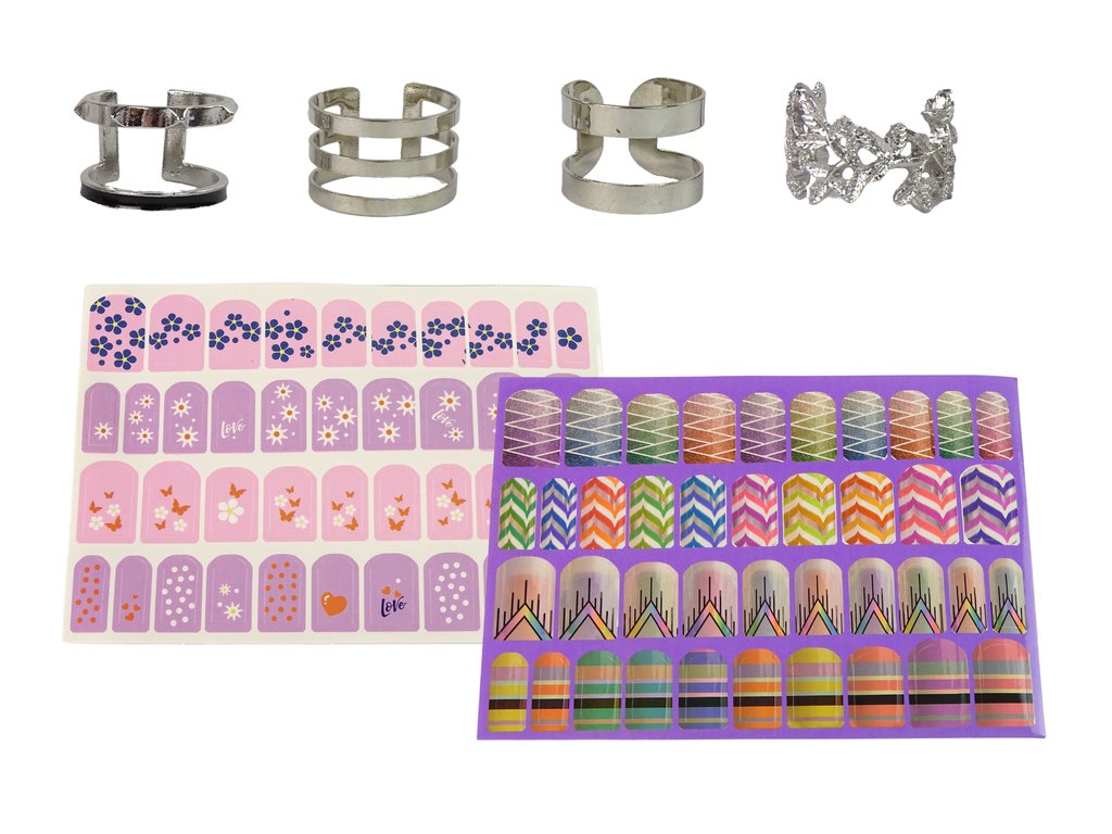 Vícebarevná sada laků na nehty a různé barevné samolepky. Klasické, vzorované a třpytivé samolepky vám umožní vytvořit krásnou manikúru, kterou lze rychle a neinvazivně odstranit běžným odlakovačem.