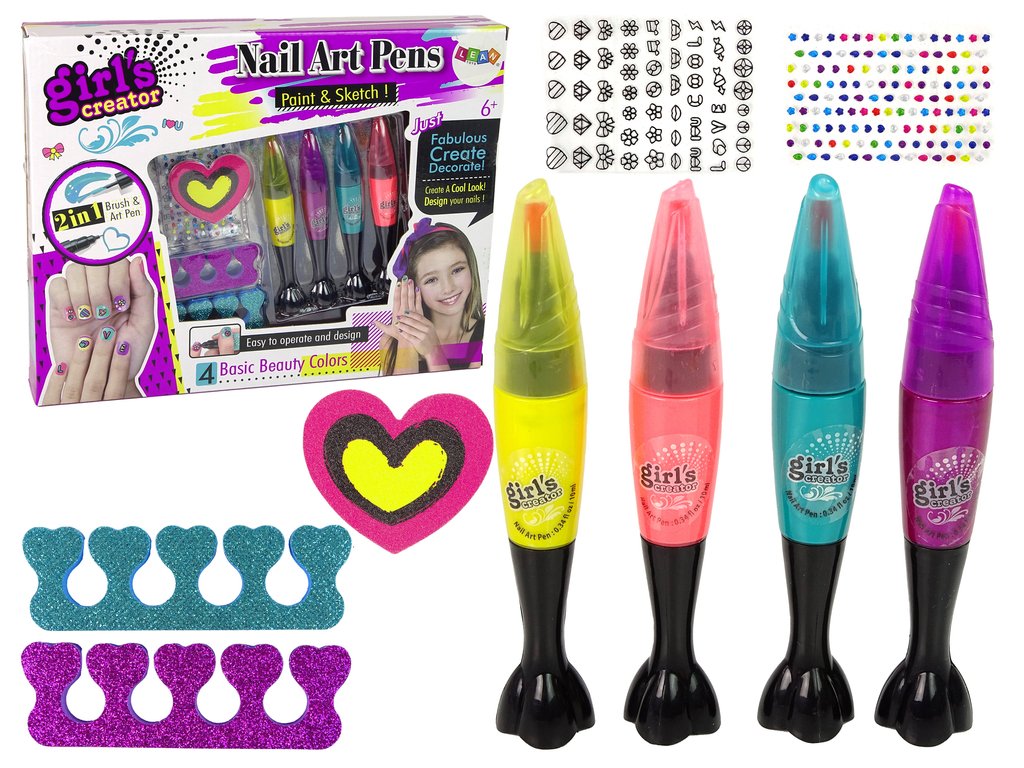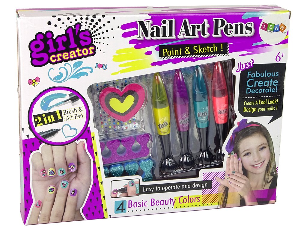 Po vyrovnání délky a tvaru nehtů pilníkem ve tvaru srdce naneste na nehty vybranou barvu. Pera umožní přesné malování vzorů a dodávají se ve dvou barvách. Malováním vzorů si holčička rozvíjí přesnost a vytváří si vlastní styl. Nálepky dodají originalitu.