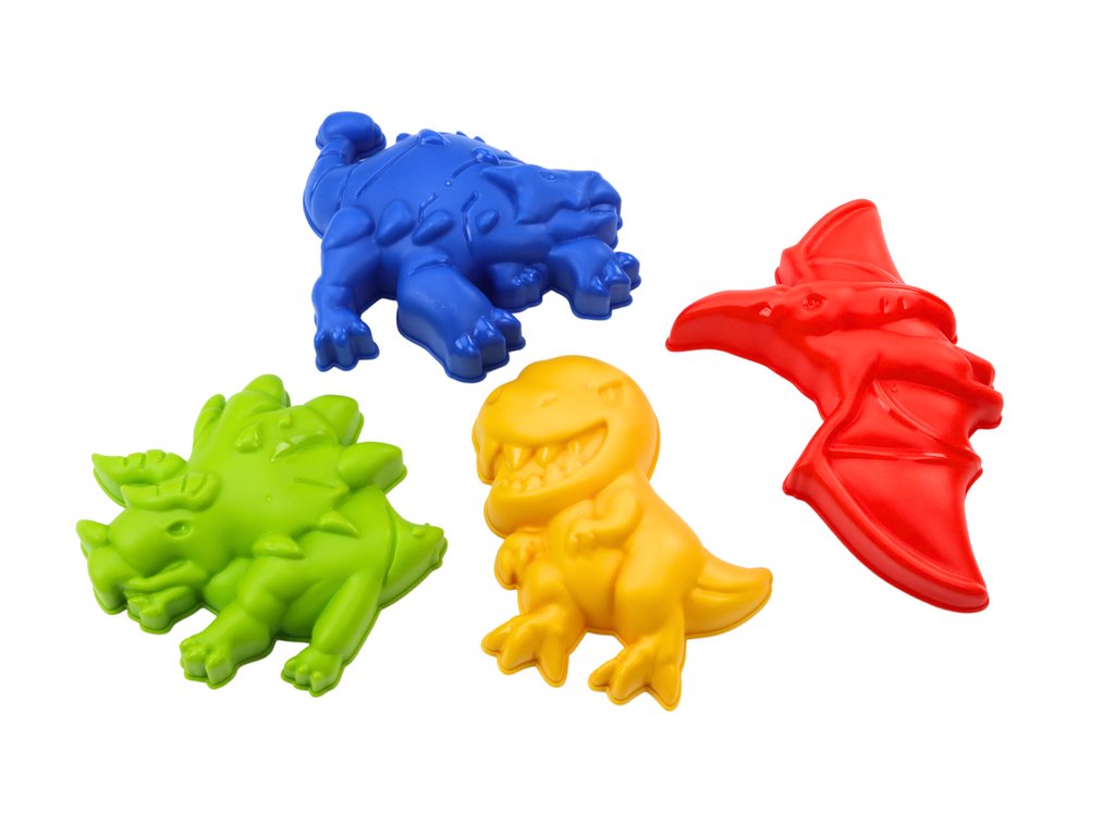 Sada také obsahuje lopatku a hrábě, které jsou nezbytné pro kopání, stavění a vytváření různorodých pískových konstrukcí. Navíc sada zahrnuje 4 formičky a konev dinosaurus, které umožňují dětem vytvářet různé tvary a vzory v písku, především dinosaury. Konev přiložená k sadě umožňuje přesné polévání písku vodou, což je ideální pro tvorbu složitějších staveb.