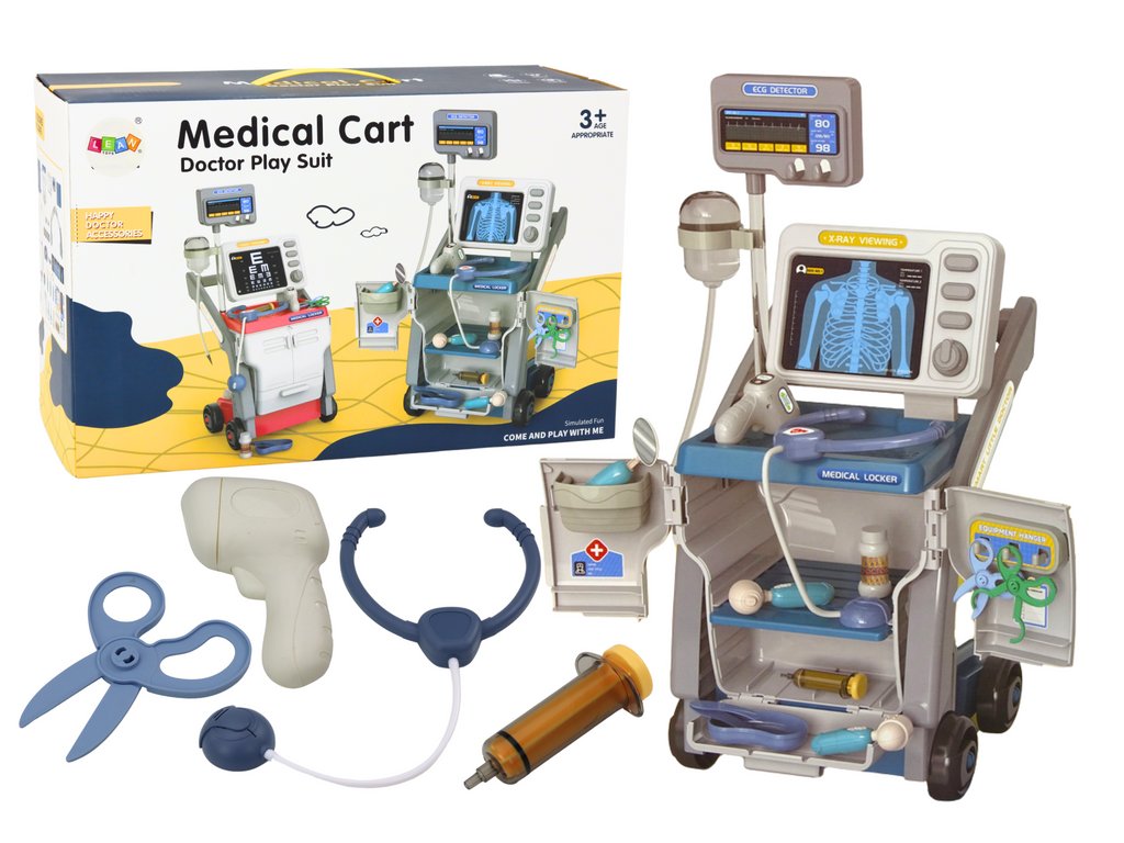 Představujeme vám modrou sadu pro malé lékaře, která očaruje všechny nadšence medicíny. Součástí sady je "vozík" na kolečkách a také bohatý výběr nezbytných lékařských nástrojů, včetně injekce, nůžek a stetoskopu na baterie.