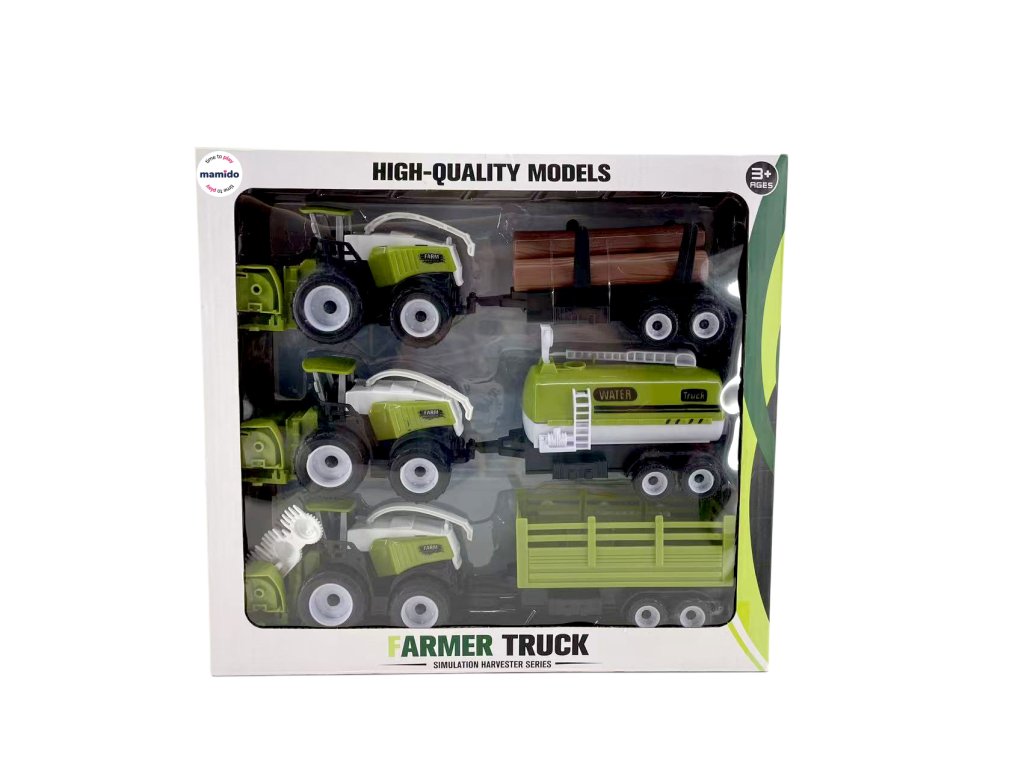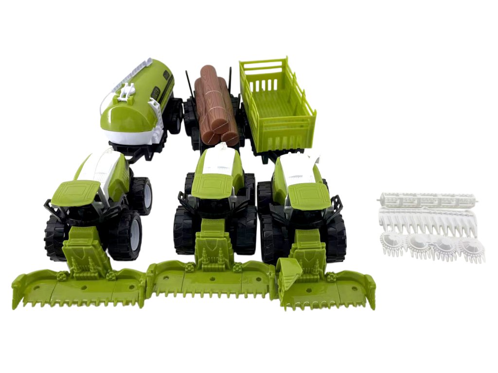 Realistická sada tří farmářských kombajnů s vleky potěší všechny malé fanoušky zemědělských strojů. Každý kombajn má vlastní žací lištu a k němu připojitelný vlek – cisternu na vodu, přívěs na dřevo a nákladní farmářský vlek. Díky detailnímu zpracování a odolnému plastovému provedení si děti mohou užít hodiny hraní na farmáře.