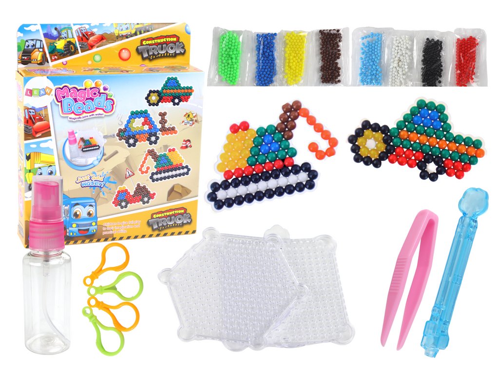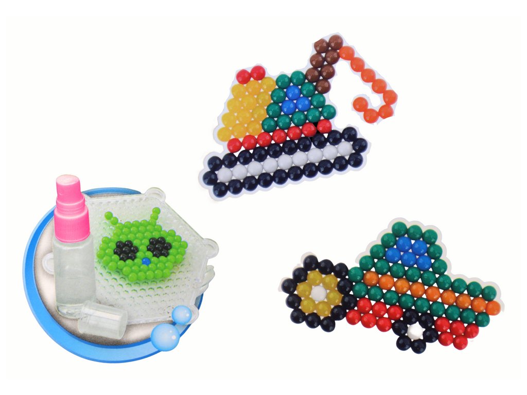 Sada navíc obsahuje dva talířky ve tvaru čtverce a šestiúhelníku pro vytváření různých vzorů a kompozic. Lahvička s vodou umožňuje korálky snadno namočit, aby se daly slepit.