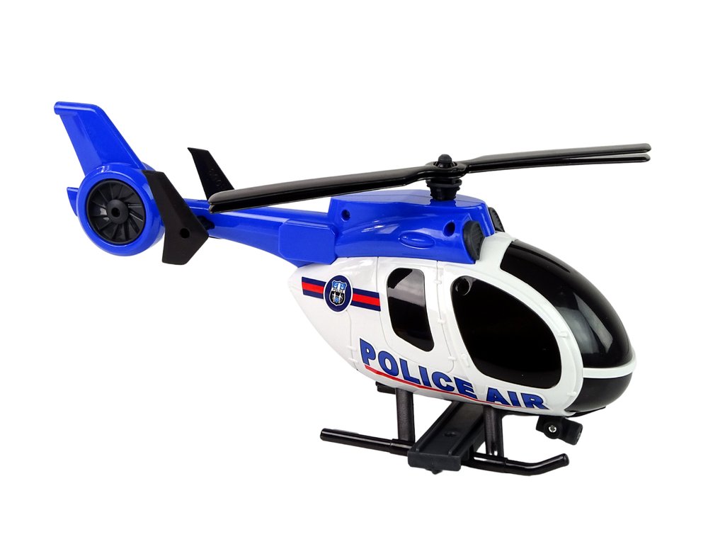Velká modrá helikoptéra má pohyblivé a otáčivé vrtule. Rozpětí vrtulí je 20 cm. Na boku vrtulníku je tlačítko, které aktivuje světelné a zvukové efekty. Auto má výrazné policejní nálepky, tónovaná okna a gumové pneumatiky. Na rovném povrchu dosahuje neuvěřitelné rychlosti. Hračky jsou vyrobeny z plastu, takže jsou lehké a zcela bezpečné.