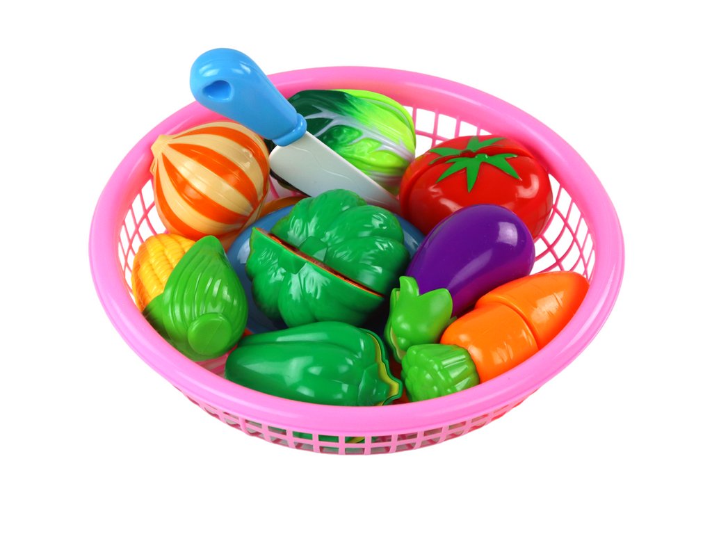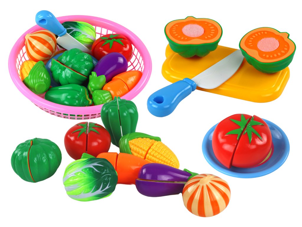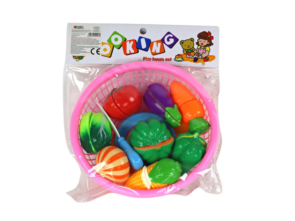 Obsah tohoto roztomile navrženého košíčku zahrnuje osm druhů zeleniny, jako je mrkev, rajče, cibule, zelená paprika, kukuřice, batát, salát a zelená dýně. Každá zelenina je spojena suchým zipem umožňujícím bezpečné krájení, což pomáhá dětem rozvíjet motorické dovednosti.