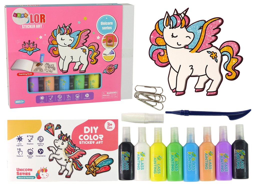Sada obsahuje různorodé nálepky, které připomínají magické jednorožce, barevné duhy a zářící hvězdy. Vaše dítě bude moci vymalovat produkt podle své vlastní představivosti. Nálepka má pouze rámeček, vyplnění závisí na Vás. Přiložených 8 barev a třpytivost udělají nálepky na oknech zářící a třpytící se jako skutečná kouzelná země.