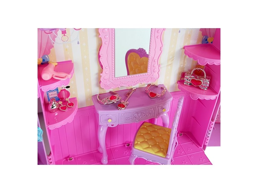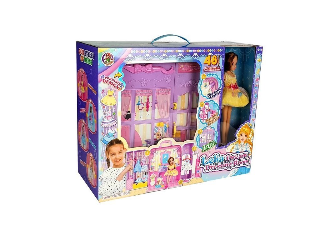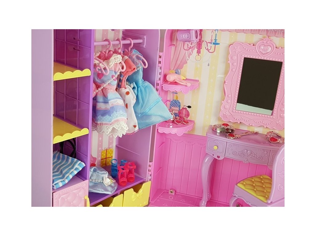 Velkou výhodou našeho šatníku je, že má světla, která osvětlují beauty koutek. Navíc můžete změnit úhel dopadu malých reflektorů. Mnoho lesklých doplňků a napodobenin pečující kosmetiky Vám umožní připravit panenku na hraní od začátku do konce s nejmenším detailem.