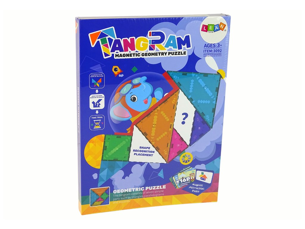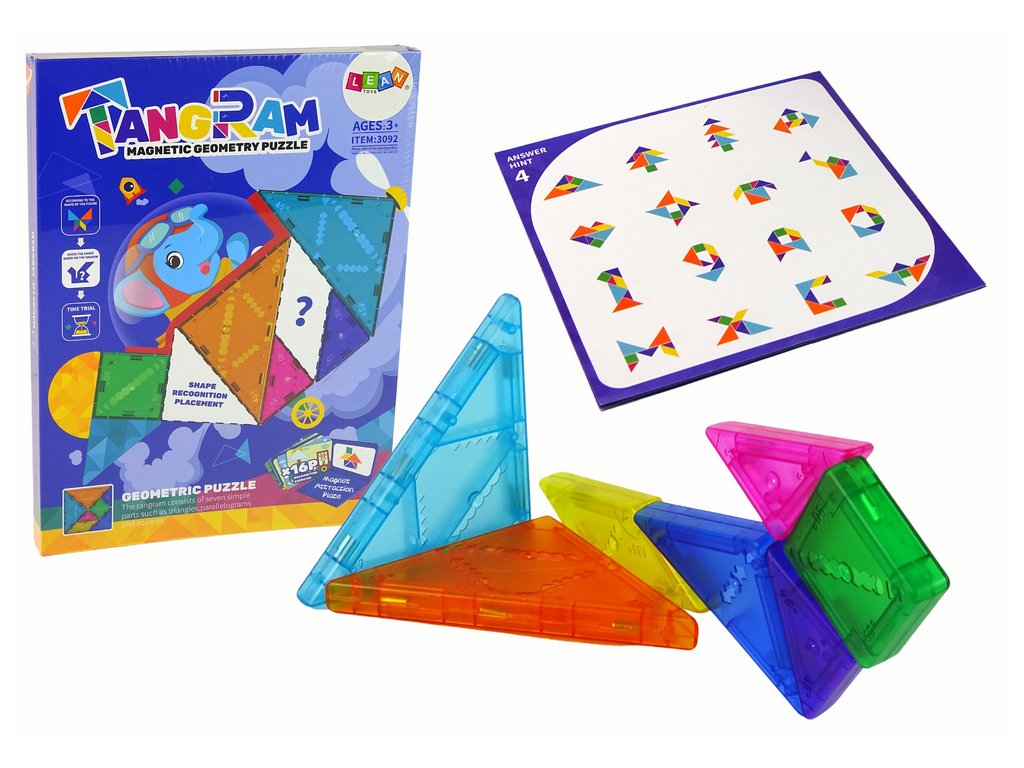 Skládačka tangram je inovativní a vzdělávací hračka, která dětem poskytne nespočet příležitostí k tvořivé a logické hře. Sada se skládá ze 7 magnetických bloků různých tvarů a barev, včetně 5 trojúhelníkových, 1 čtvercového a 1 rovnoběžníkového. Každý blok je vybaven magnetem, díky kterému je lze snadno kombinovat a vytvářet nejrůznější kombinace.