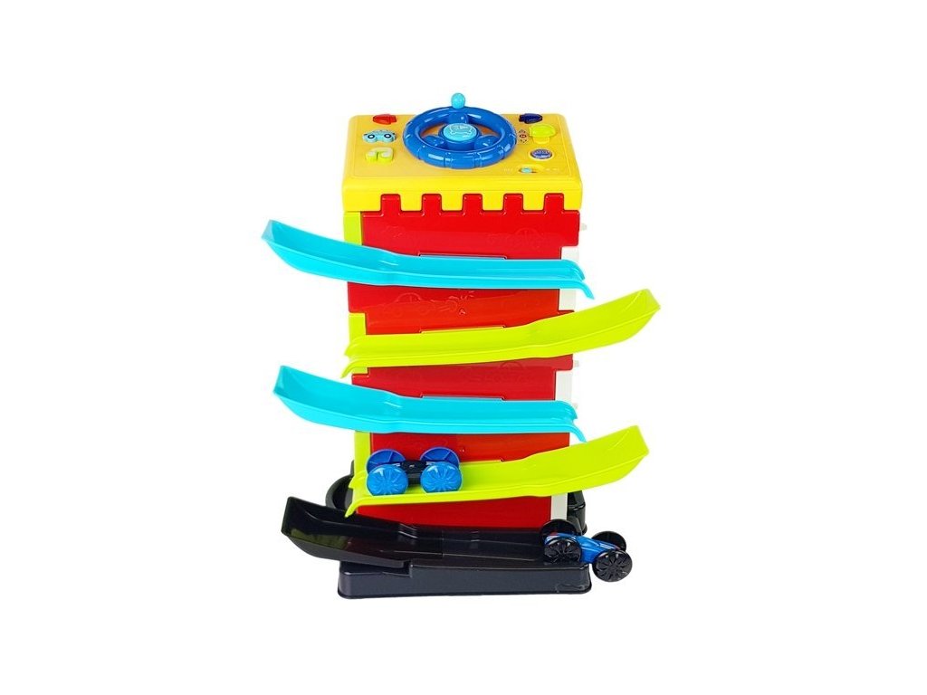5. hraj si s autíčkem, které sjíždí po rampě úplně nahoře (součástí balení jsou 2 autíčka).