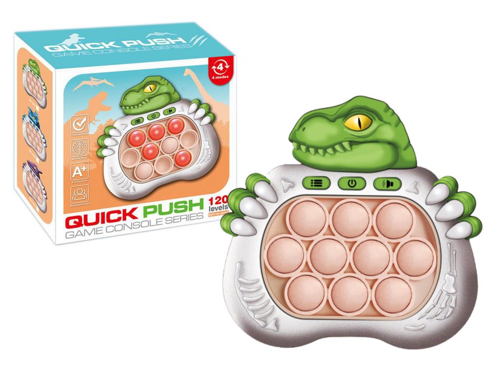 Senzorická hra Pop It s motivem dinosaura nabízí interaktivní zábavu s kombinací světel a zvuků, která zaujme děti i dospělé. Hra vyžaduje, aby hráči sledovali a opakovali sekvence světelných signálů stiskem příslušných "bublinek", čímž nejen poskytuje zábavu, ale také rozvíjí paměť a kognitivní schopnosti.