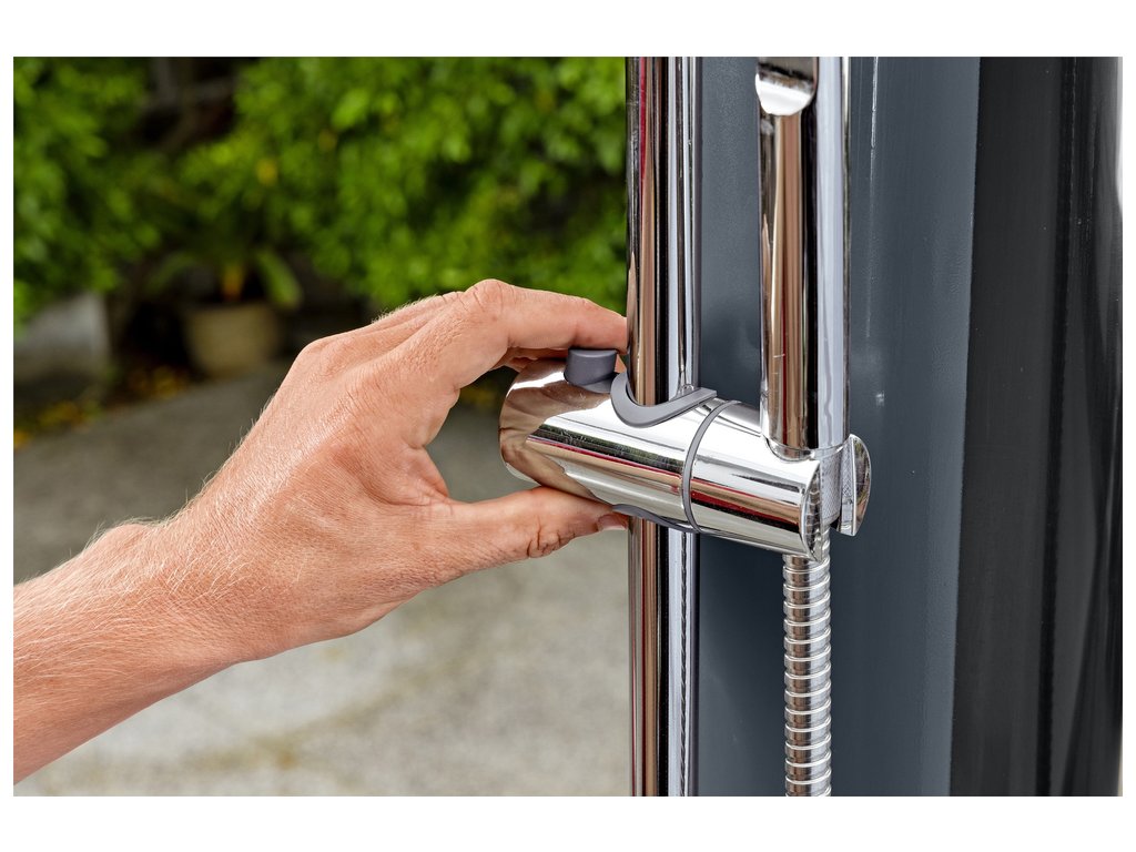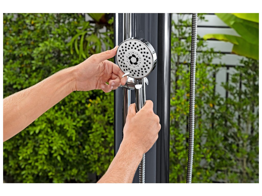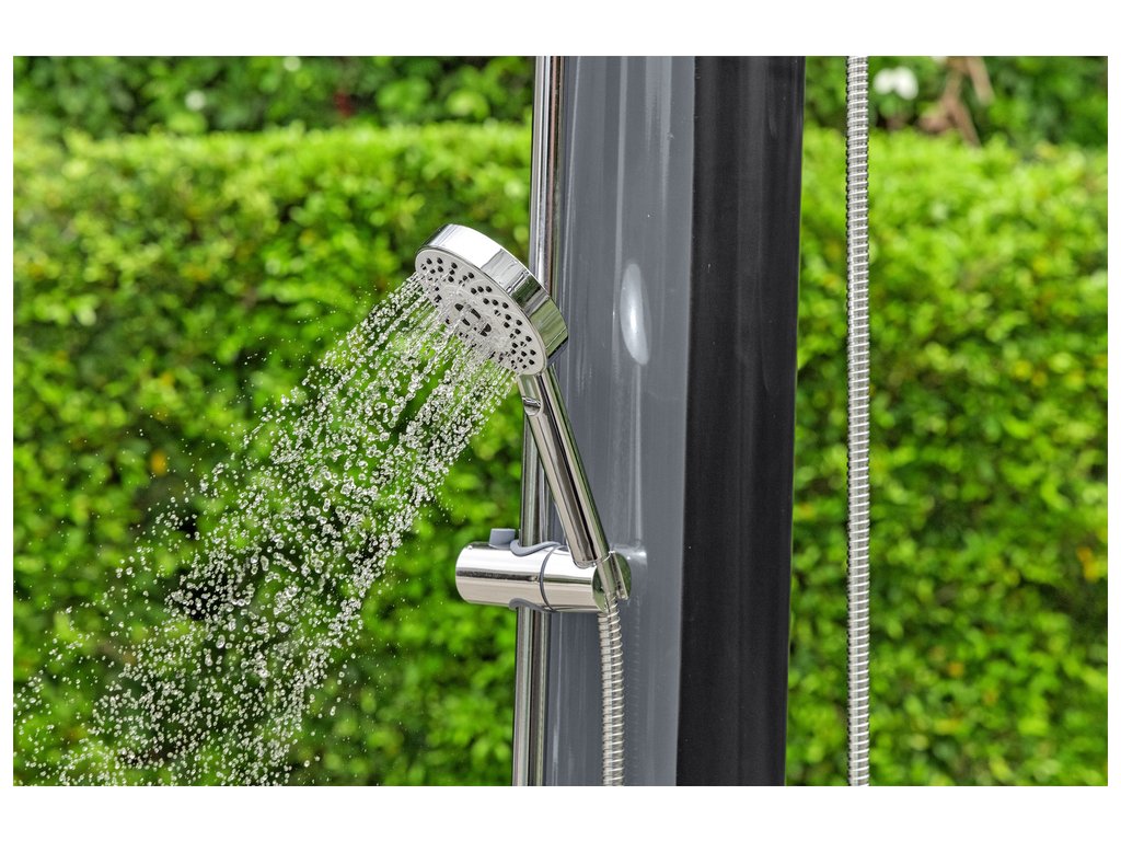 Solární sprcha s nastavitelnou teplotu vody. Hlavice s nastavitelnými tryskami. Sprcha může samovolně stát na podstavci nebo může být namontována na jakýkoliv povrch.