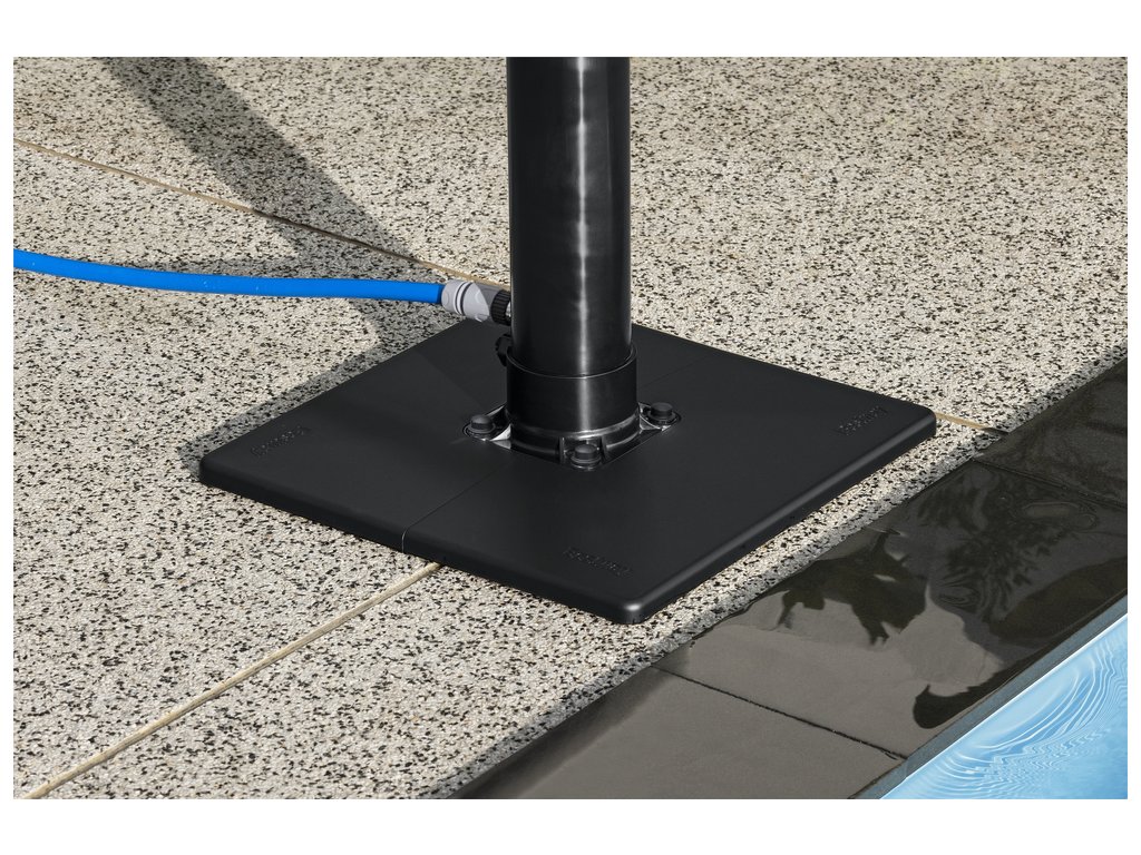 Solární sprcha s nastavitelnou teplotu vody má pevný podstavec, který zajistí stabilitu. Sprcha je vyrobená z odolného materiálu, který zaručuje dlouhou životnost výrobku a odolnost vůči povětrnostním podmínkám.