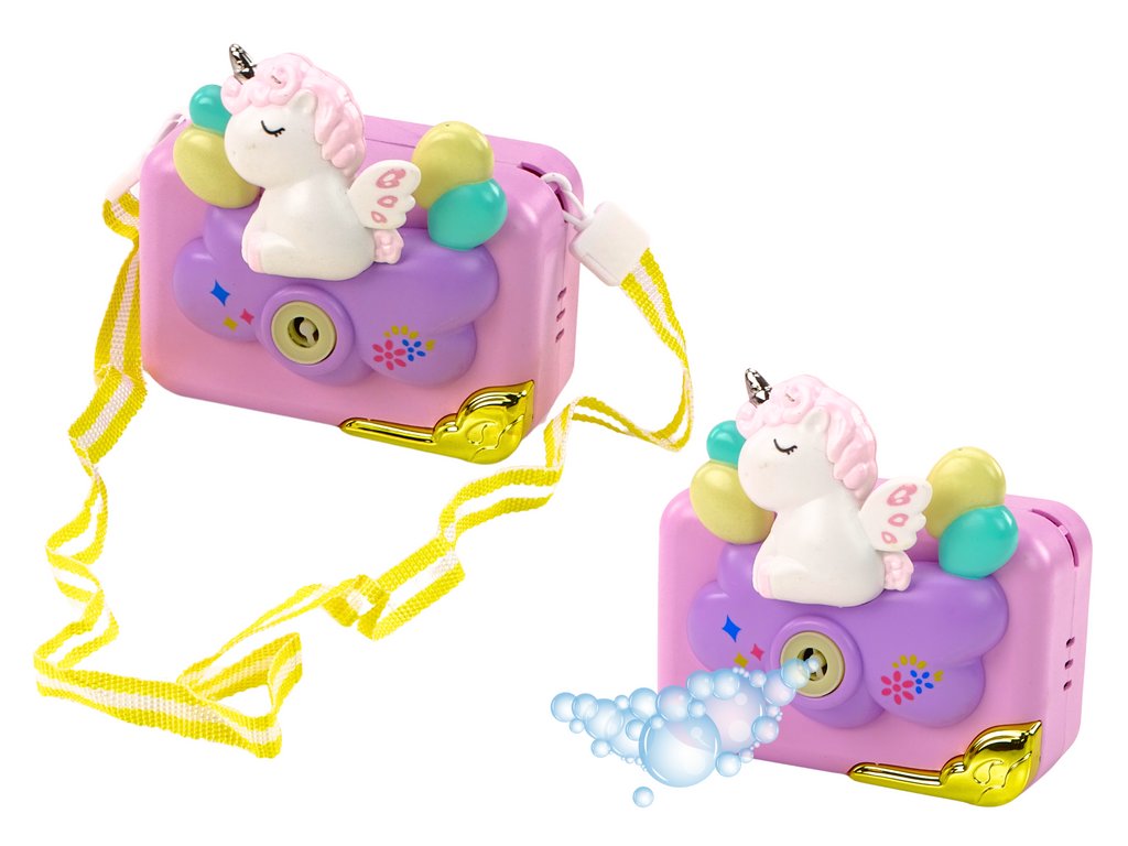 Stroj na bubliny ve tvaru fotoaparátu s jednorožcem