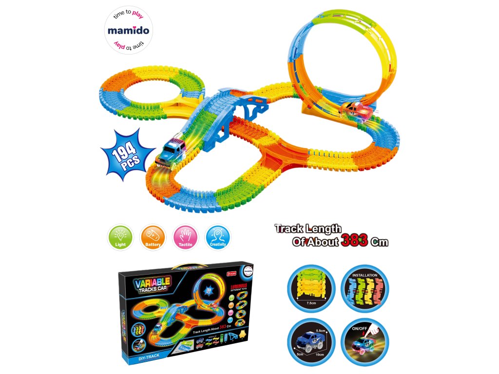 Barevná svítící autodráha s celkovou délkou až 383 cm přinese dětem hodiny zábavy. Dráha se skládá z 194 dílů, které lze libovolně sestavovat, a nechybí ani mosty, smyčky a zatáčky. Součástí balení je LED autíčko, které při jízdě svítí a projíždí celou tratí včetně smyčky. Díky snadnému systému spojování si děti mohou trať pokaždé sestavit jinak a rozvíjet tak svou kreativitu a představivost.