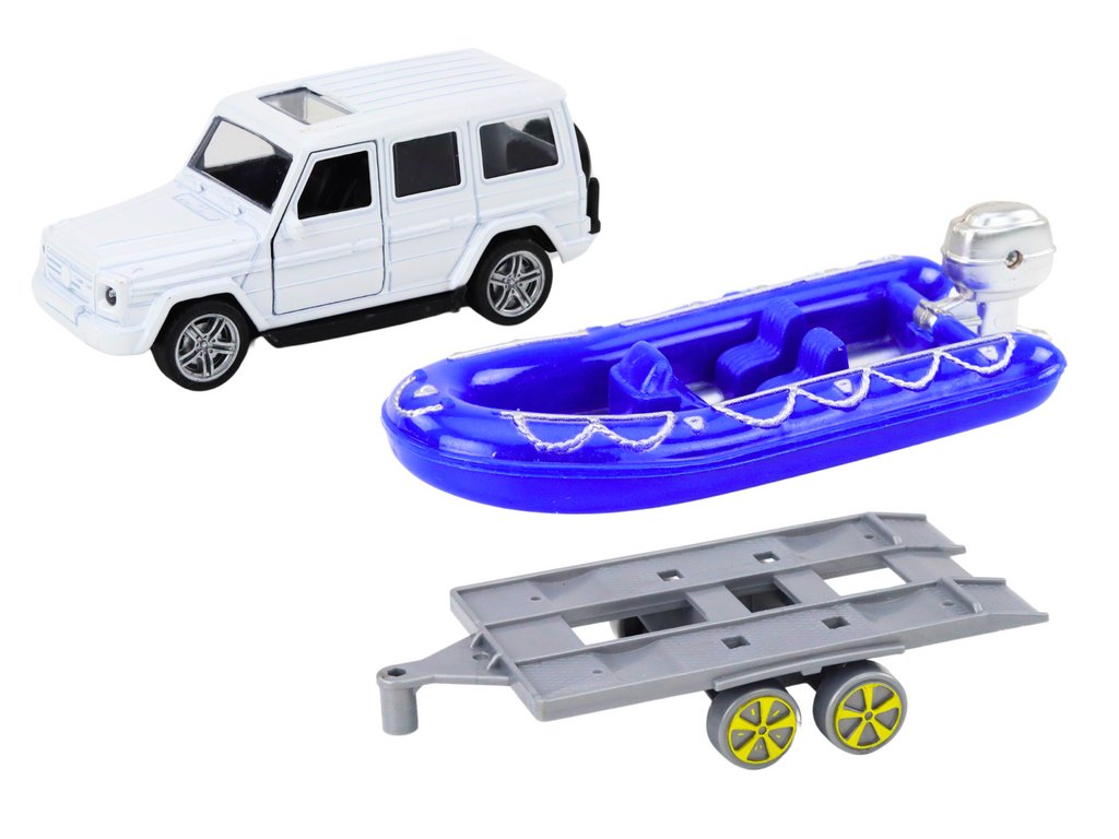 Na zadní části auta je připevněný přívěs s modrým motorovým člunem, který přidává hře na rozmanitosti a umožňuje dobrodružství jak na souši, tak na vodě. Tato hračka nejenže nabízí dlouhotrvající zábavu díky kvalitní konstrukci, ale také podporuje kreativitu a pohybovou koordinaci.