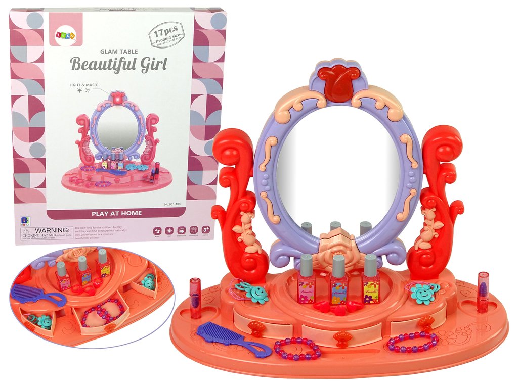 Toaletní stolek je perfektním tipem na dárek pro malou parádnici. Okouzlující set ve dvou odstínech červené s prvky fialové umožní každé princezně hrát si před zrcadlem už od rána. Zrcadlo je vyrobeno z bezpečného plastu, ve kterém malá princezna uvidí svou krásnou tvářičku. Ve spodní části zrcadla jsou 3 šuplíky s mořskými mušlemi.