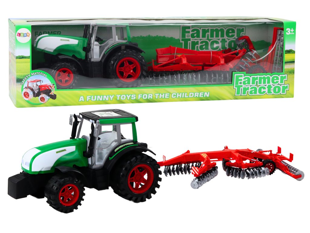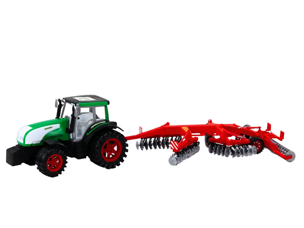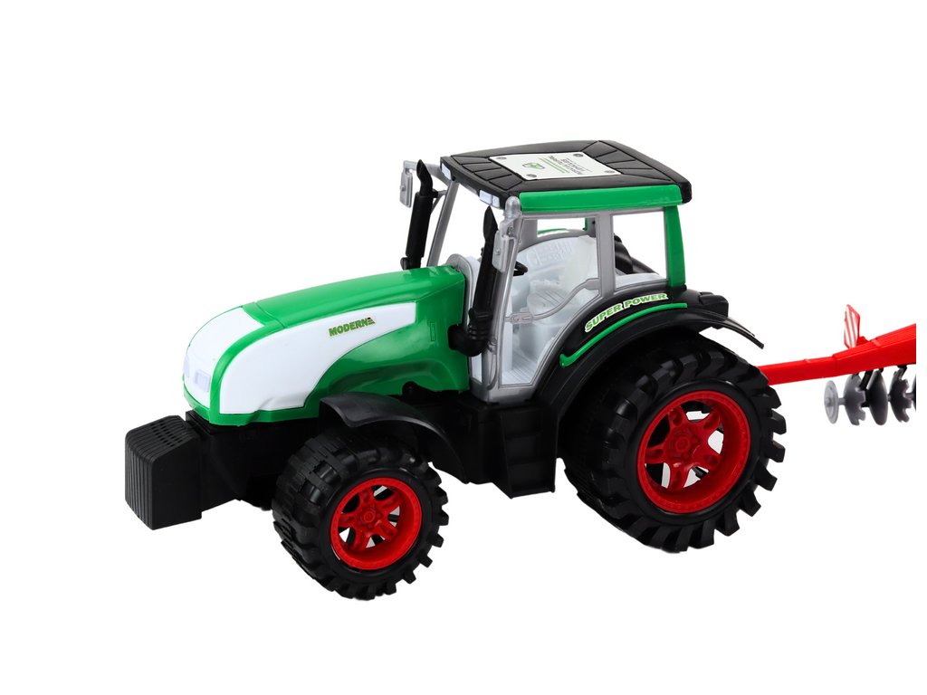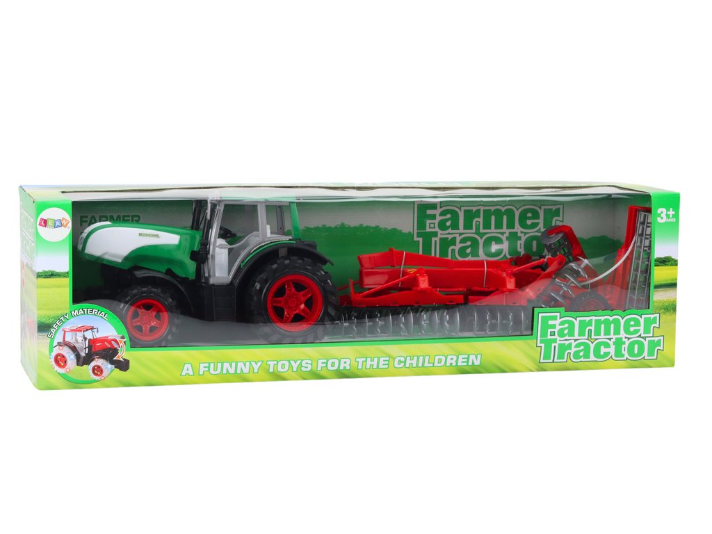 Traktor v elegantních a moderních černozelených barvách poutá pozornost a vypadá jako skutečné zemědělské vozidlo. Má otevírací kapotu, což přidává na realističnosti a umožňuje dětem nahlížet do "motoru", což je skvělý vzdělávací prvek. Traktor je vybaven obrovskými, solidními koly, která zajišťují stabilitu a vynikající jízdní vlastnosti. Kabina traktoru vypadá jako opravdová, s detaily, které určitě potěší každé dítě. Přívěs vybavený strunovými válci, které slouží k mísení půdy, je ideálním doplňkem k setu a umožňuje simulovat skutečné zemědělské práce. Set obsahuje také vál ke kosení obilí, což umožňuje ještě všestrannější hru a hraní různých zemědělských scénářů. Traktor má pohon zadních kol, což znamená, že po rozjetí sám jede vpřed, což dodává dynamiku a realističnost při hře.