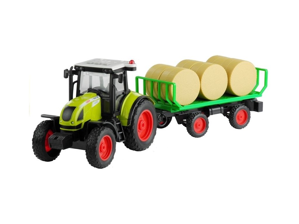 Zelený traktor s odnímatelnou vlečkou, který veze 6 balíků sena. Tyto prvky lze z přívěsu odebrat. Celá sada je vyrobena z vysoce kvalitního materiálu a jeho konstrukce je bez ostrých prvků a hran.