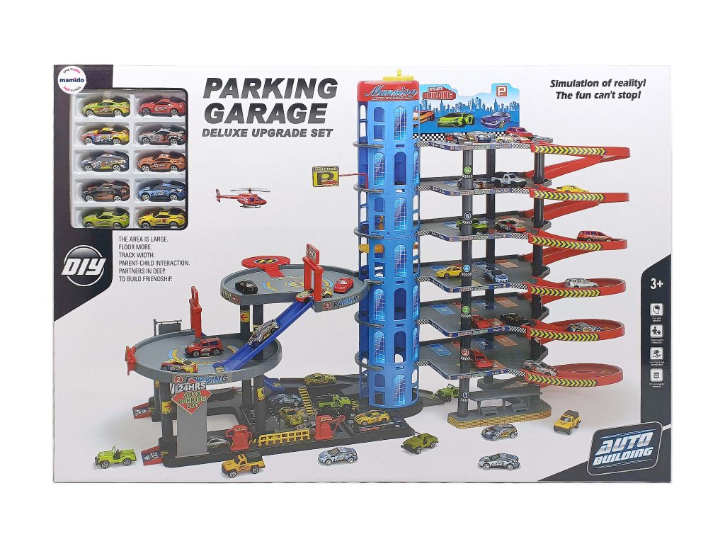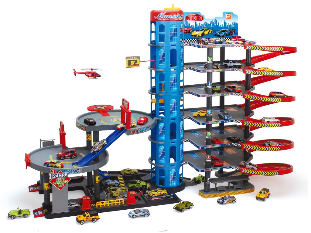 Velká a detailně propracovaná vícepatrová garáž s výtahem, spirálovými sjezdy a bohatou výbavou pro hraní s autíčky. Děti mohou auta vytahovat pomocí mechanického výtahu až do horních pater a poté je pouštět dolů po dlouhých spirálových drahách. Součástí jsou také autíčka, doplňky a interaktivní prvky, které zajišťují dlouhotrvající zábavu.
