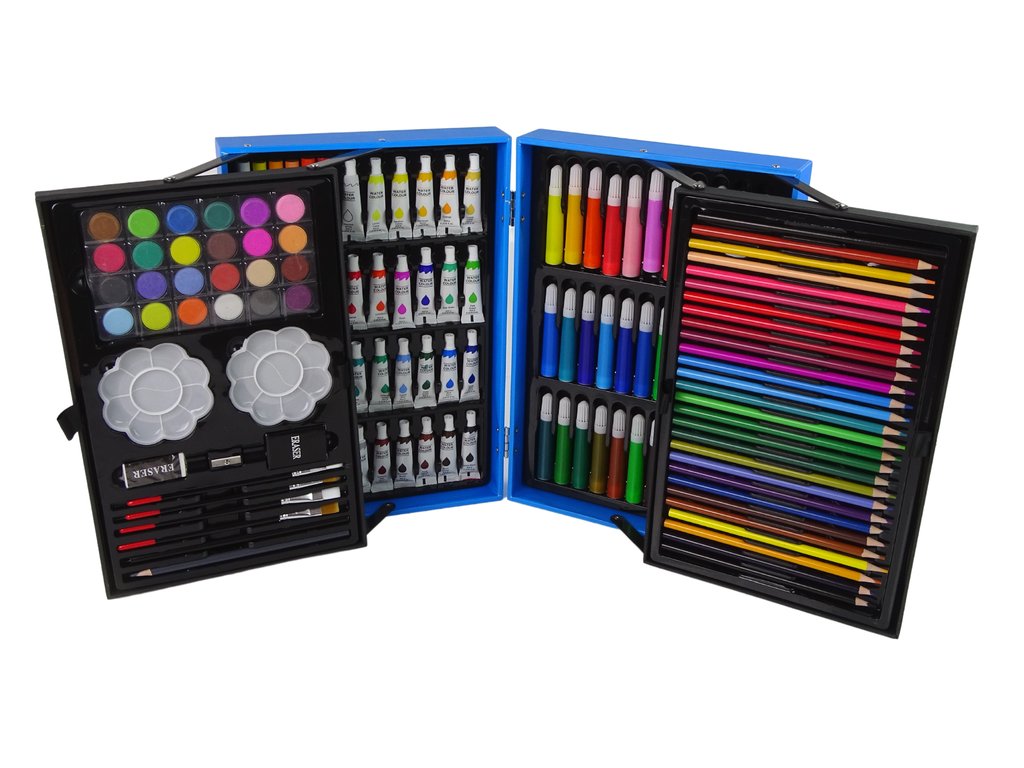 Bohatá paleta barev a různé druhy nářadí se hodí při skicování, vybarvování a mnoha dalších činnostech. Probuďte v sobě umělce a vyjádřete se prostřednictvím barev! Tento produkt vyniká mezi ostatními uměleckými sadami tím, že je uzavřený v elegantním, zesíleném kufříku z odolného plastu. Všechny prvky sady jsou úhledně uloženy uvnitř a celý kufřík lze uzavřít.