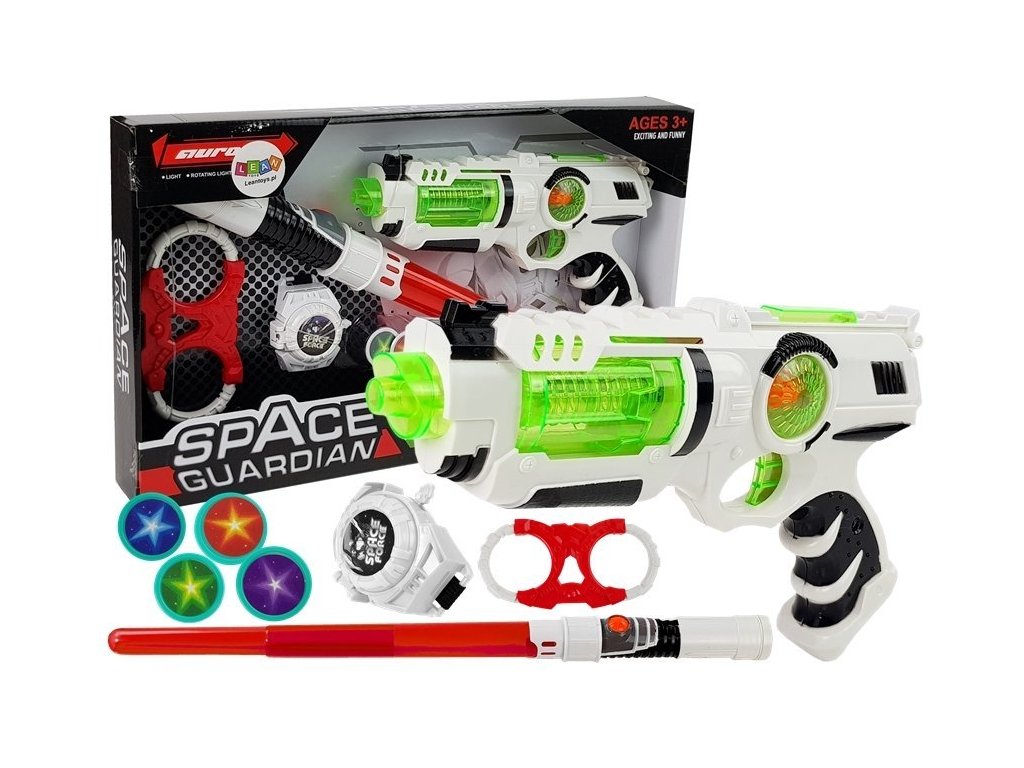 Představujeme sadu vesmírných zbraní, která se skládá ze světelného meče, laserové pistole a vrhače disků. Pistole po stisknutí svítí a vydává zvuky, stejně tak jako světelný meč. Tyto hračky se budou vyjímat ještě lépe v zatemněné místnosti.
