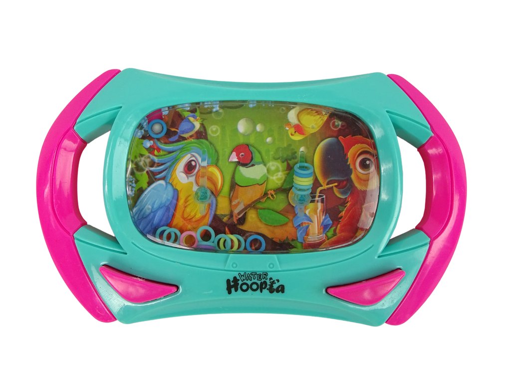 Hračka do vody má tvar konzole v zelené a růžové barvě. Uvnitř je grafika veselých papoušků.