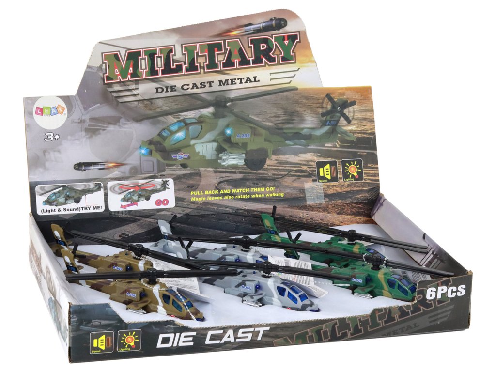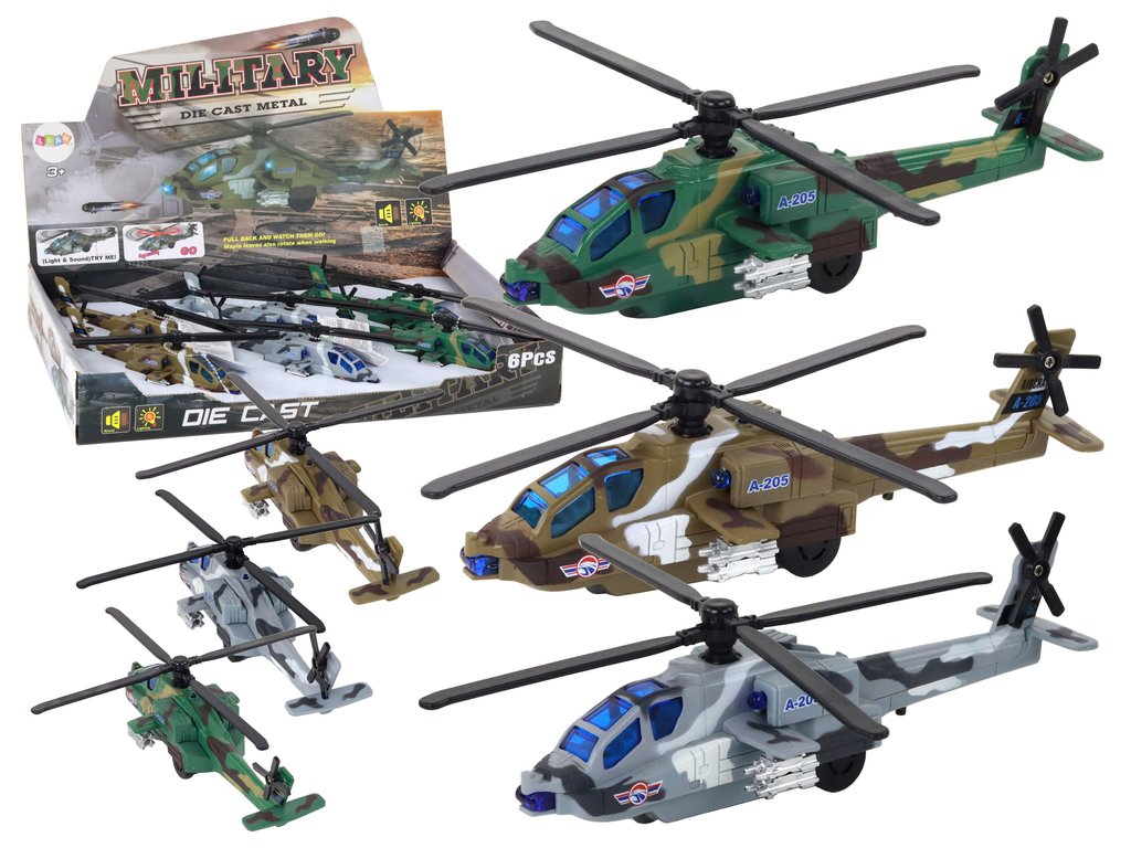 Tento set hliníkových vrtulníků je inspirován vojenskými modely. Každý má unikátní design a je k dispozici v různých barvách, což přináší rozmanitost do setu. Set obsahuje 6 různých vrtulníků, což ho činí atraktivním pro děti, které si mohou užívat různých modelů.