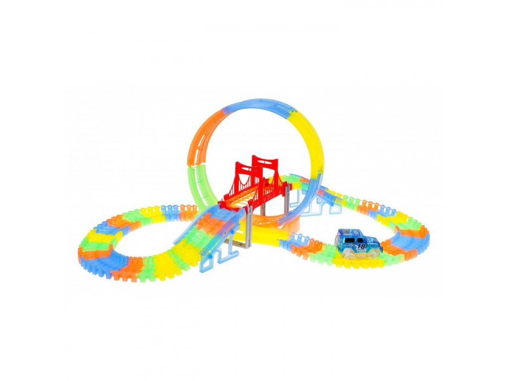 Svítící dráha v temnotě s okruhem a přiloženým autíčkem je skvělým dárkem pro děti již od 3 let věku. Dráhy jsou flexibilní, což umožňuje různé kombinace - můžete je otáčet, zvedat, překládat, a to dokonce i během jízdy autíčka. Navíc jsou dráhy fluoreskující a svítí v temnotě. Vozidlo v setu má LED podsvícení, což vytváří ohromující efekt během jízdy v temnotě. Autíčko je napájeno bateriemi 2 x AA 1,5V (nejsou součástí balení). Pro spuštění autíčka jednoduše stiskněte tlačítko na jeho střeše.