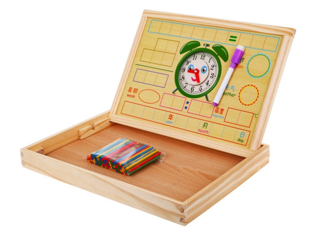 Magnetická dřevěná tabule s výukovými doplňky je vzdělávací hračka pro děti od 3 let. Bohatě vybavená sada zabaví vaše děti na velmi dlouhou dobu. Díky této sadě se dítě seznámí s čísly, sčítáním, odčítáním, násobením a dělením, s dny v týdnu, ročními obdobími, geometrickými tvary, počasím, hodinami a tabulkou násobení. Sada je ideální pomůckou při učení a rozvíjí umělecké dovednosti.