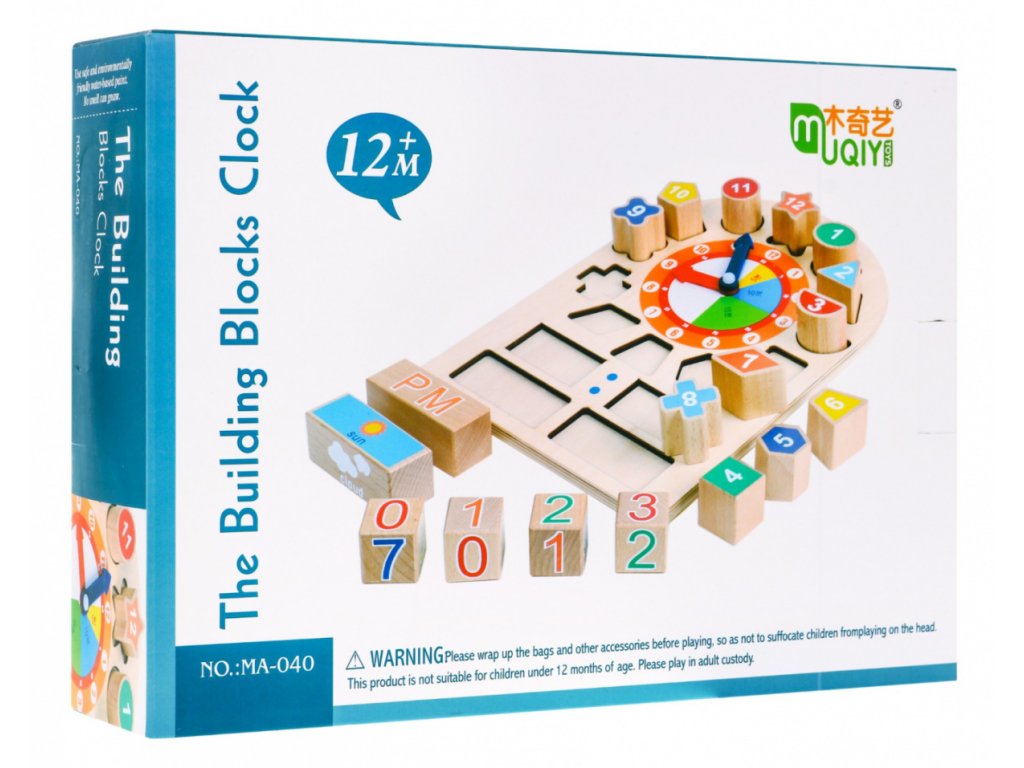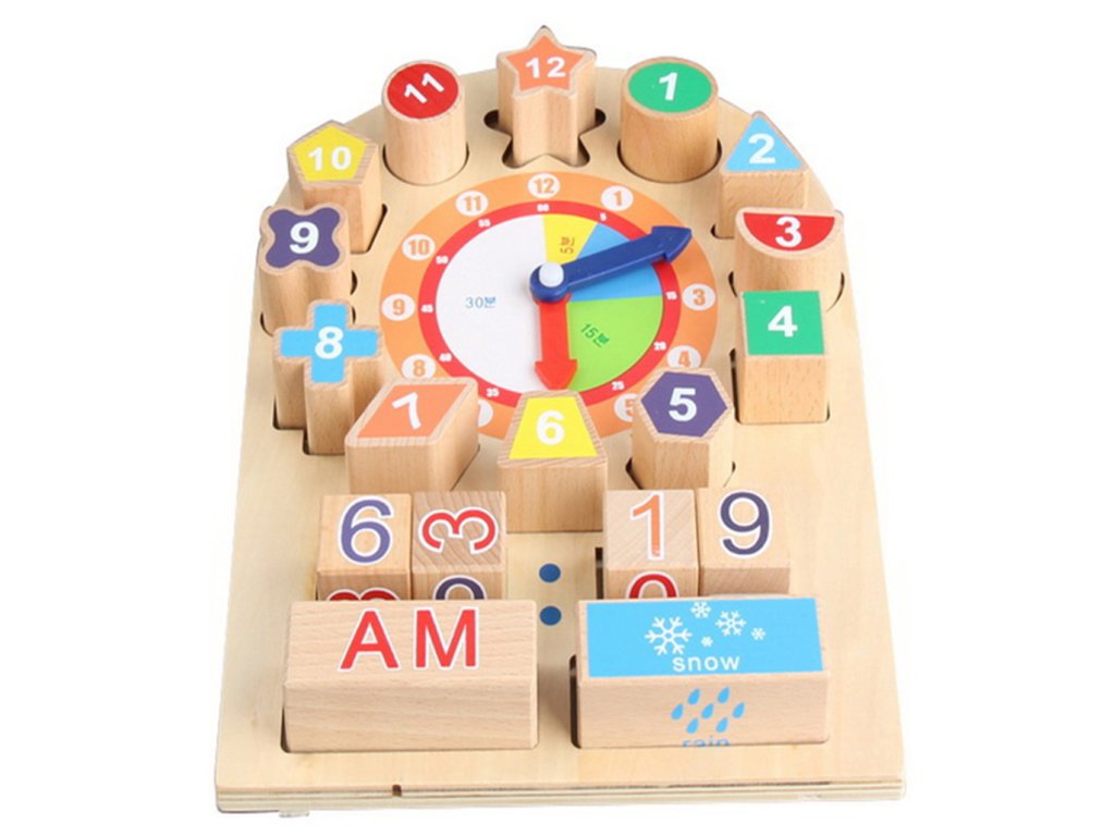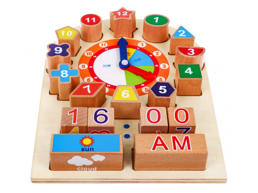 Dřevěné vzdělávací hodiny mají pohyblivé ručičky, které lze libovolně nastavit, a tím se učit nastavený čas. Kostky s čísly umožní děti okamžitě zapsat. Na dřevěných blocích se nachází obrázky s počasím a denní dobou.