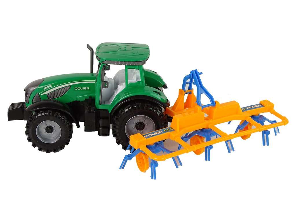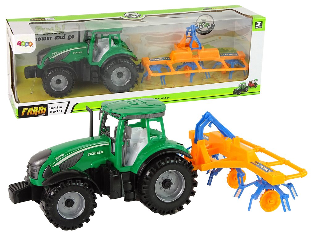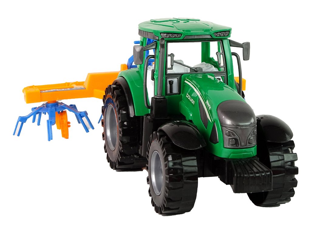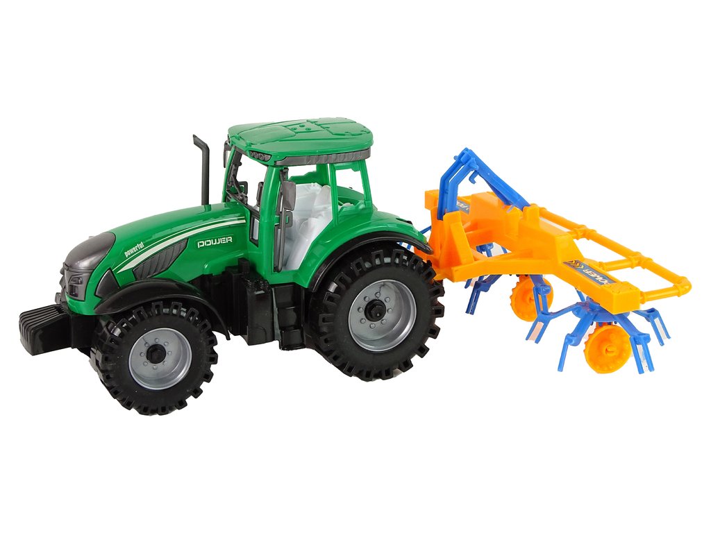 Traktor s rozmetačem sena třecí pohon zelený