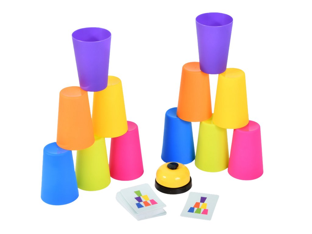 Soutěžte v rychlosti a zručnosti s hrou, která propojuje logické myšlení a reflexy. Úkolem hráčů je sestavit barevné kelímky podle vzorů na kartách a jako první zazvonit na zvonek.