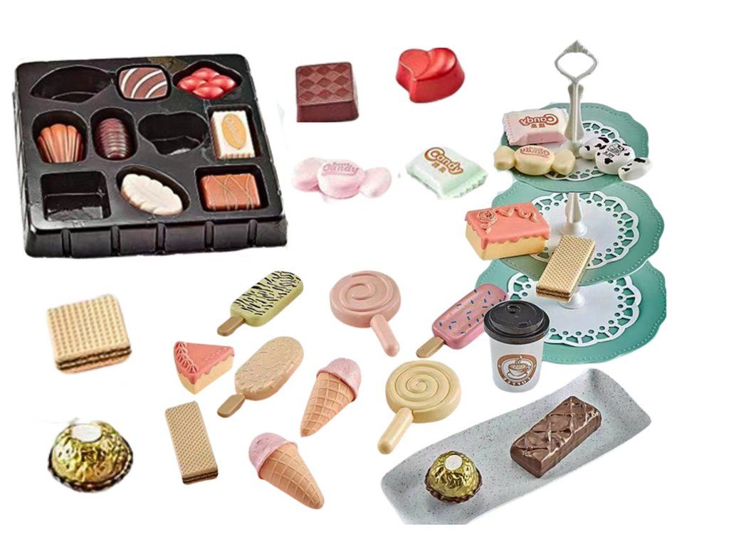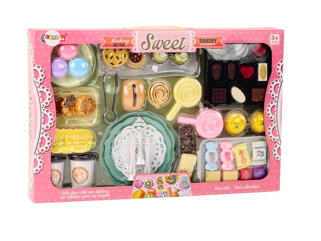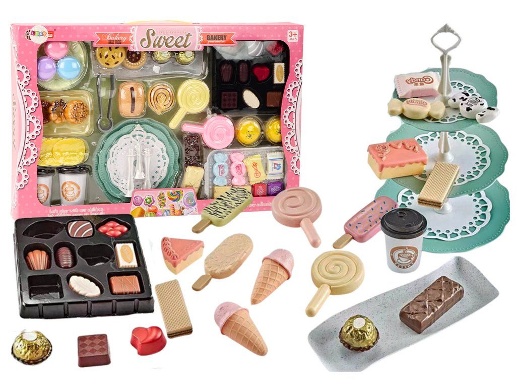 Set di caffetteria per bambini che trasporterà i piccoli cuochi nel mondo dei dolci piaceri e del divertimento creativo. Il set include una ricca selezione di figurine di dolci, tra cui waffle, stecche, gelati, torte, lecca-lecca e molto altro.