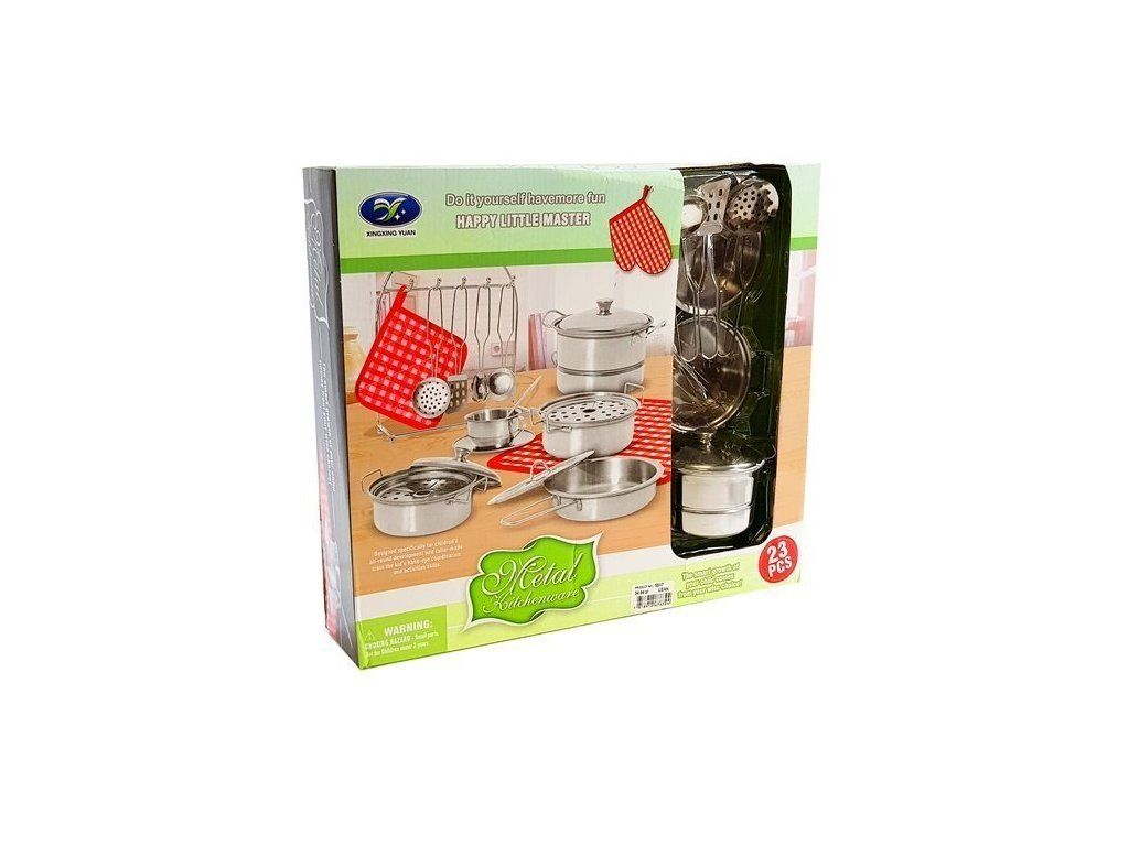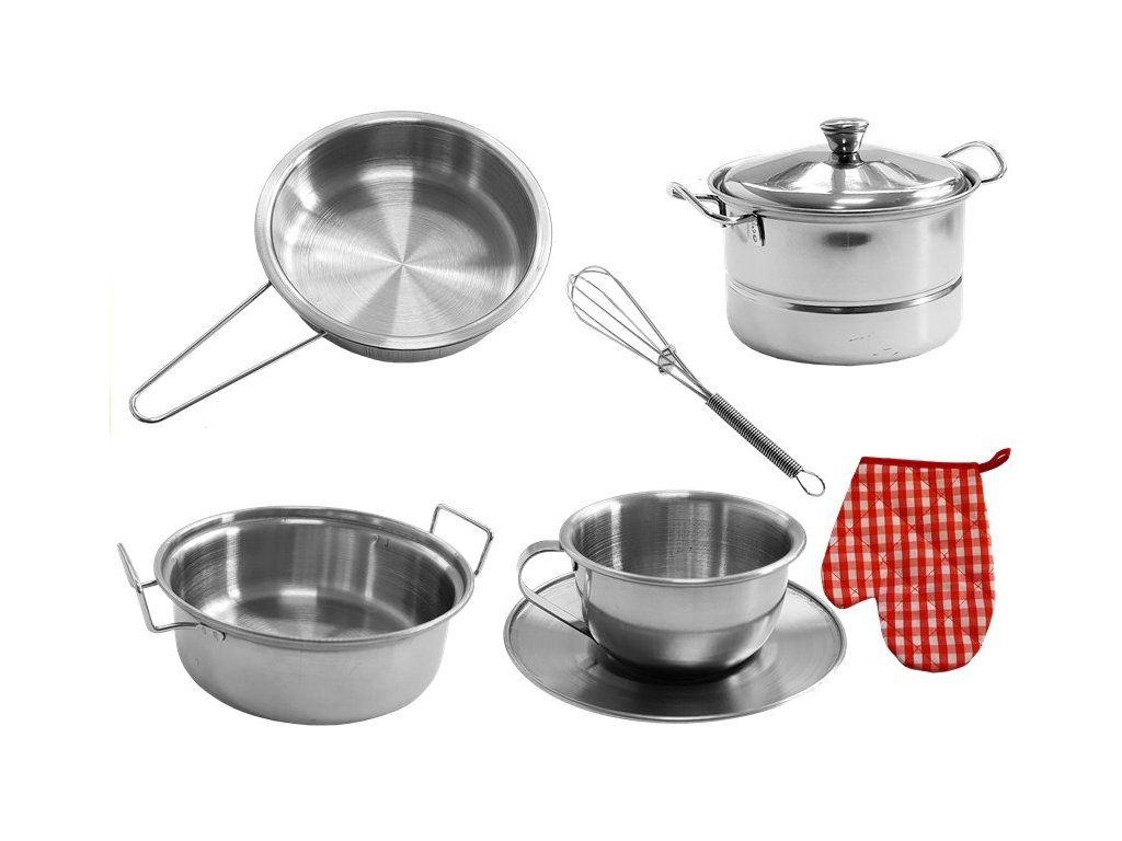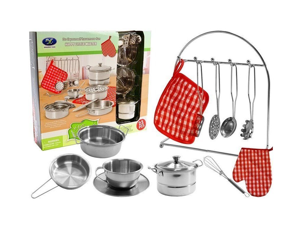 Velká sada Nerezového nádobí do dětské kuchyňky 23 ks Hrnce Zástěra