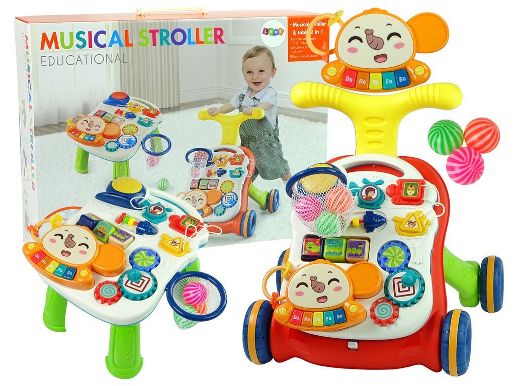 Interaktivní chodítko a stoleček je produkt, který představujeme. Spojuje funkce chodítka, výukového panelu a stolečka v jednom. Chodítko doporučujeme pro všechna batolata starší 12 měsíců. Je výborným pomocníkem při učení samostatné chůze. Je navrženo s ohledem na nejmenší děti, což zaručuje bezpečnou konstrukci. Pokud chcete, aby si vaše dítě hrálo na místě, můžete díky blokádě zablokovat zadní kola a nalít do nádoby vodu, aby byla stabilní, takže se nemusíte bát o bezpečnost dítěte. Po blokádě zůstane chodítko na svém místě.