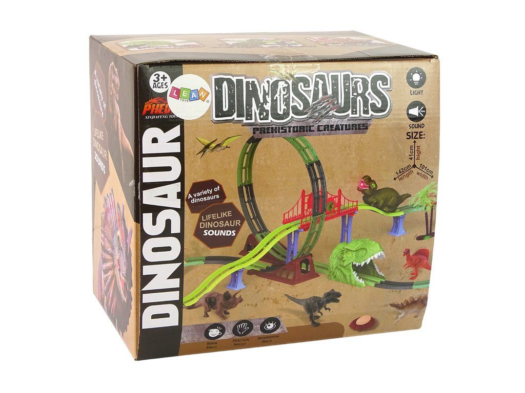 La grande pista è composta da ponti, tunnel e una grande spirale. La confezione include un dinosauro su ruote che si muove lungo la pista. La figura può illuminarsi e emettere suoni. Un vero ruggito come quello di un dinosauro! Accendi l'interruttore e guarda come sfreccia lungo il tracciato!