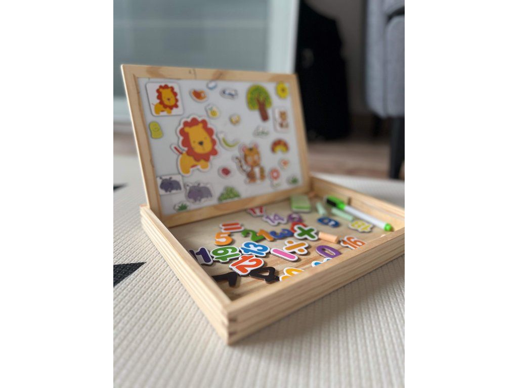 Lavagna magnetica e gessosa in legno con accessori sarà utile per lavori artistici, insegnerà al bambino a scrivere, risolvere problemi matematici, creare disegni e opere creative. Sul lato gessoso puoi disegnare con il gesso e sul lato magnetico puoi dipingere, scrivere con un pennarello cancellabile, attaccare immagini e numeri magnetici.