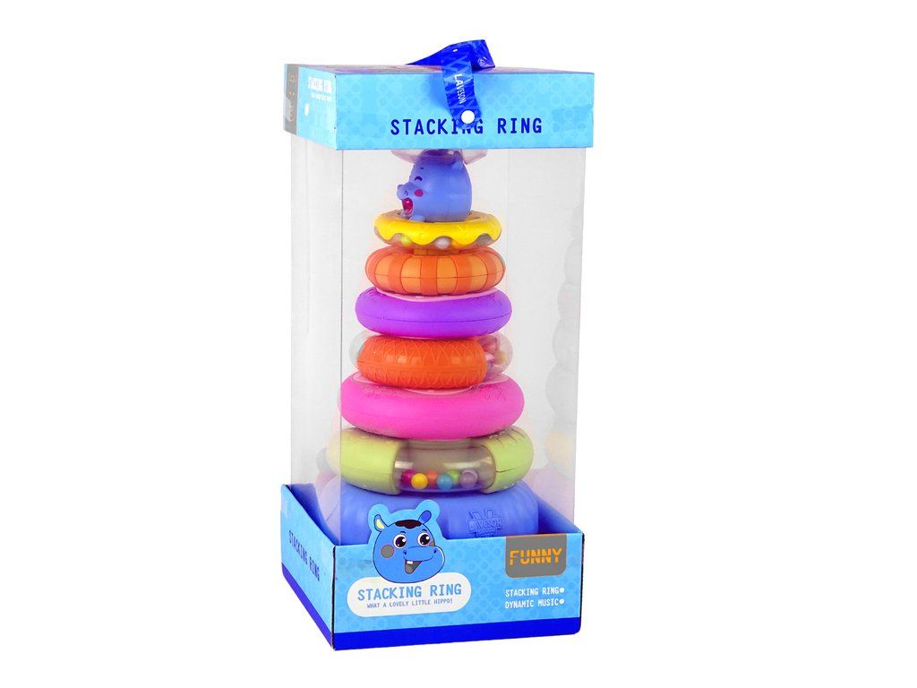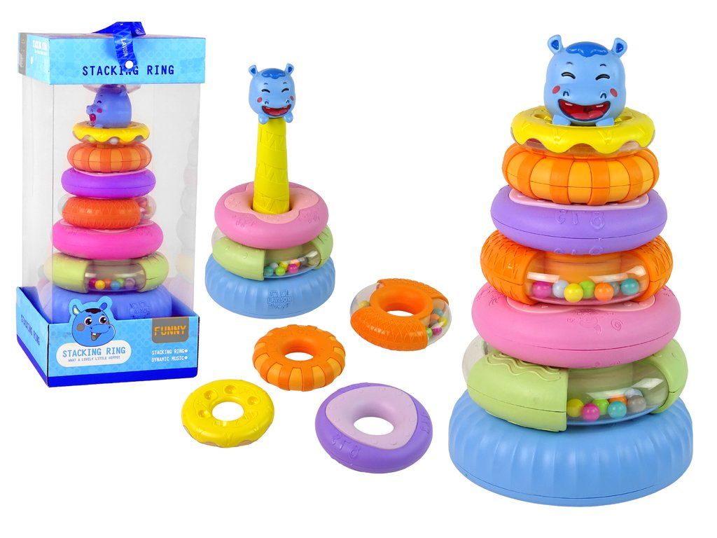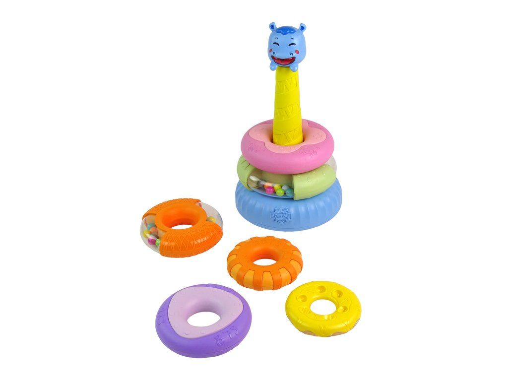 La piramide è composta da sei anelli colorati, che possono essere impilati in ordine diverso per creare la piramide. In cima alla piramide c'è un simpatico ippopotamo sorridente. Ogni anello ha una dimensione e un colore diversi, permettendo ai bambini di imparare a distinguere i colori, le dimensioni delle forme e di esercitare la coordinazione.