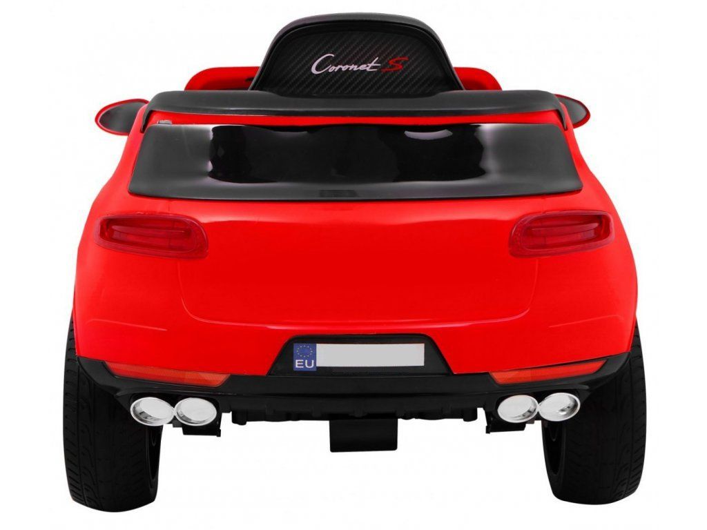 Auto elettrico per bambini Turbo-S di colore rosso. L'auto elettrica èdotata di fari anteriori e posteriori luminosi. Include un ingresso per MP3, scheda SD e USB. Per la sicurezza del bambino, è presente una cintura di sicurezza sul sedile. Per partire, basta sedersi comodamente nell'auto elettrica e poi premere il pulsante START. Nella confezione è incluso anche un telecomando per i genitori, da utilizzare quando il bambino non è ancora in grado di guidare l'auto da solo.