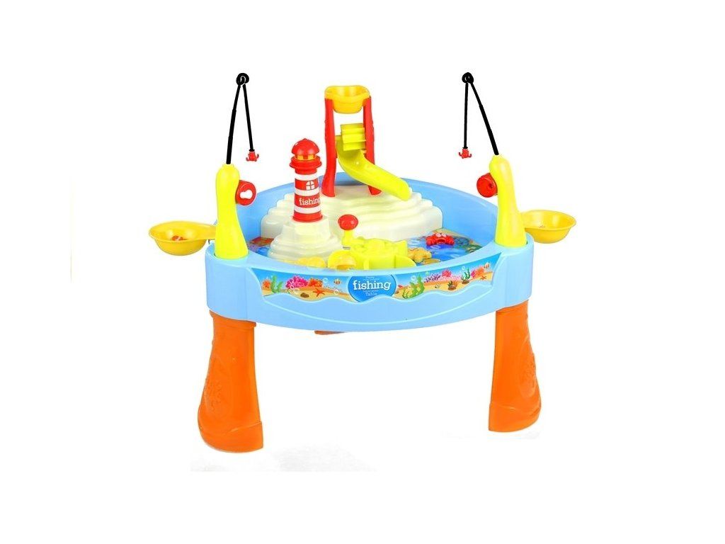 Il tavolo con piscina ha effetti sonori e luminosi speciali. Basta premere la torre faro e il giocattolo si accende o si spegne. Nella parte inferiore della piscina c'è uno spazio per inserire le batterie, che garantiscono il corretto funzionamento del giocattolo. Tutti gli esseri marini nella piscina hanno un magnete, che facilita la loro cattura dalle profondità dell'acqua. Nella parte centrale del giocattolo è posizionata una elica, che crea l'effetto delle onde marine.