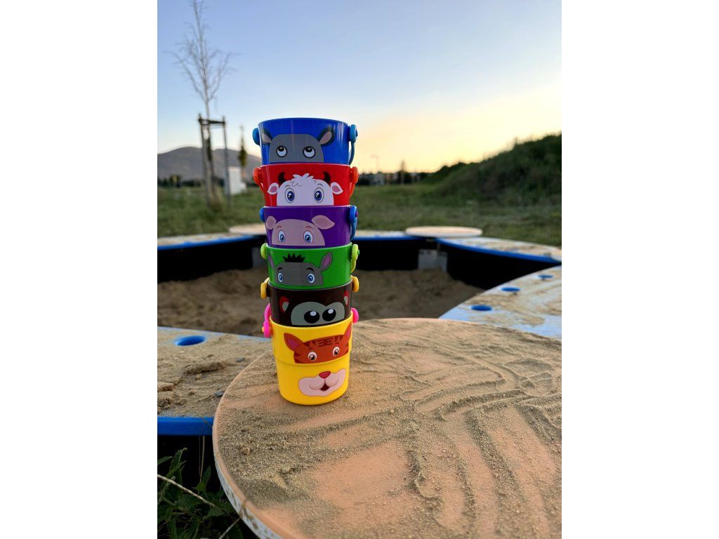 Secchi colorati sono fantastici per l'acqua, per la sabbiera e per la spiaggia. Il divertimento in acqua sarà ancora migliore con i secchi colorati. Set di 6 secchi presenta motivi di simpatici animali, come orsetti, tigri e mucche. I secchi si incastrano perfettamente l'uno nell'altro, permettendovi di creare una piramide.